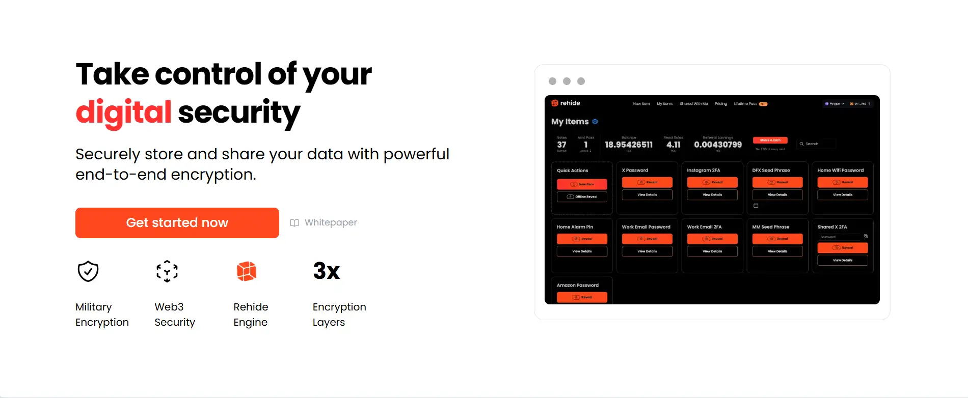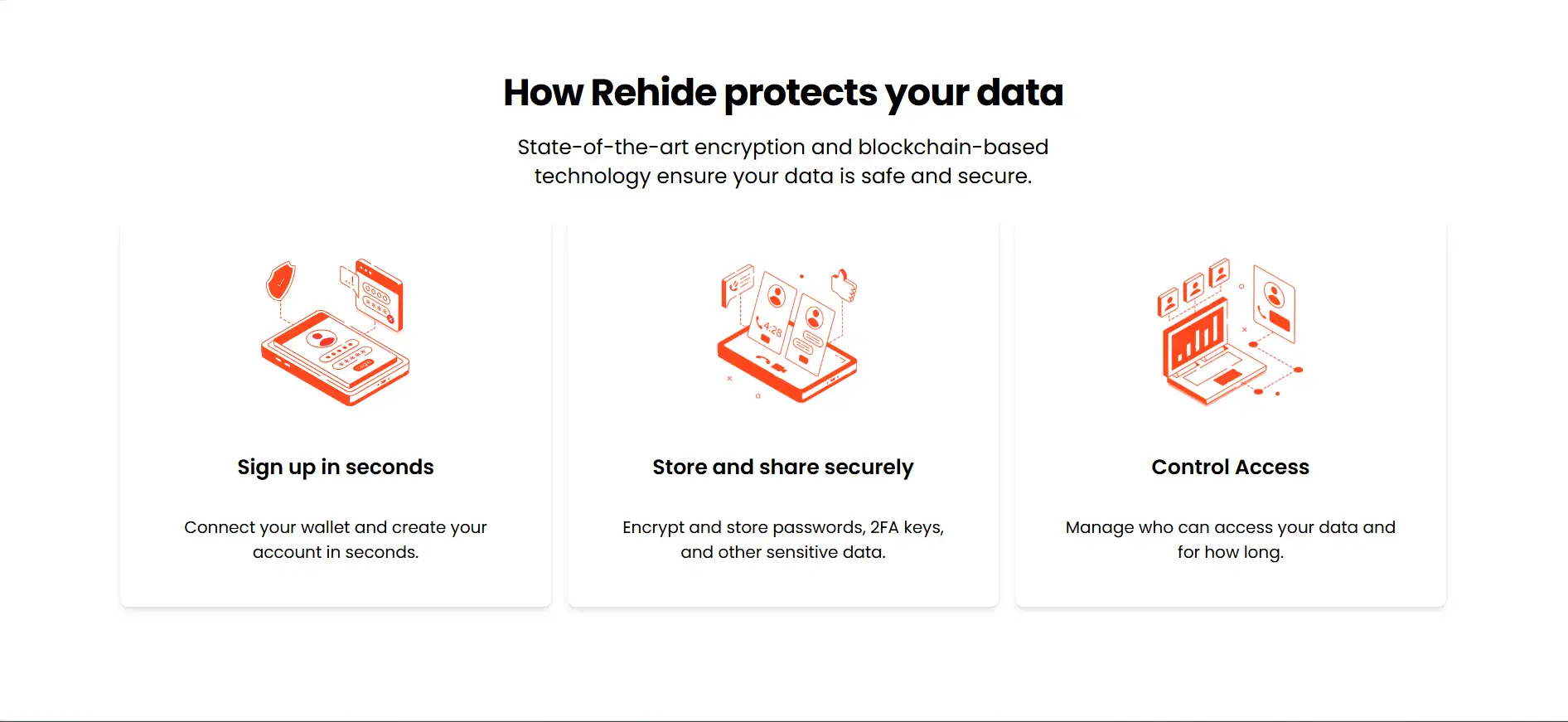 Rehide is a Web3-native data security platform that allows users to securely store, encrypt, share, and monetize sensitive information using end-to-end encryption and blockchain-based access control. Whether it’s passwords, 2FA keys, or confidential files, Rehide ensures that only you—and those you authorize—can ever access your data. The platform makes it effortless to take control of your privacy, all without compromising on usability or speed.