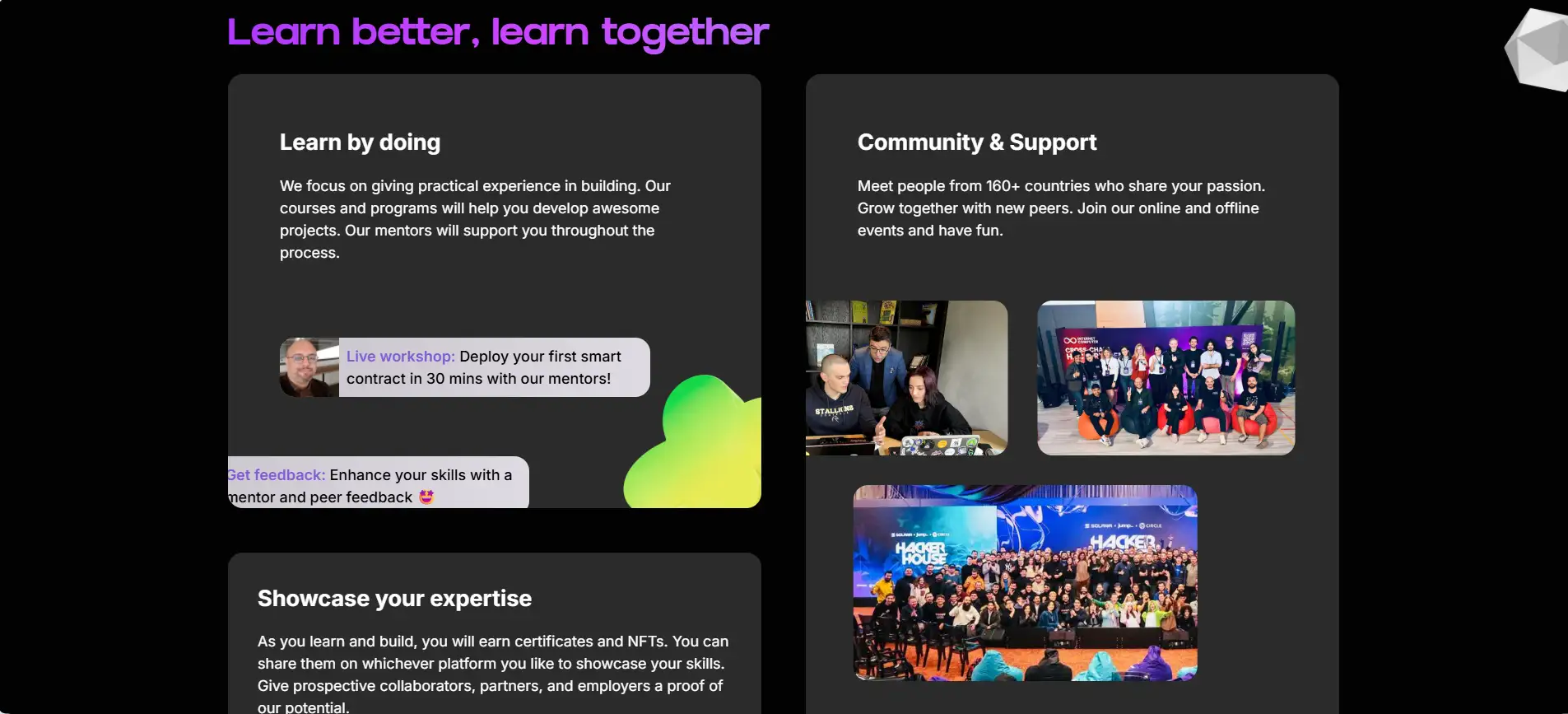 - On-Chain Certifications: Receive NFTs and digital badges as verifiable proof of completion and skill acquisition.