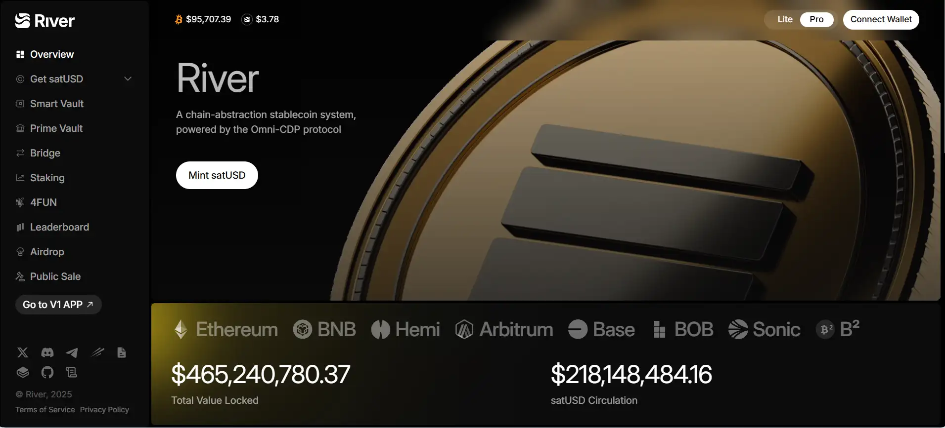 River is a bold attempt to resolve the core inefficiencies of today’s fragmented multi-chain DeFi landscape. The project was launched to address the challenges of isolated capital pools, unstable stablecoin liquidity, and disjointed governance systems that fail to reward real contributions. At the center of River’s ecosystem is satUSD, a stablecoin backed by leading crypto assets such as BTC, ETH, BNB, and LSTs. It introduces an innovative concept called omni-CDP (Cross-Chain Collateralized Debt Positions), which enables users to deposit collateral on one blockchain and mint satUSD on another—without bridges or wrapping.