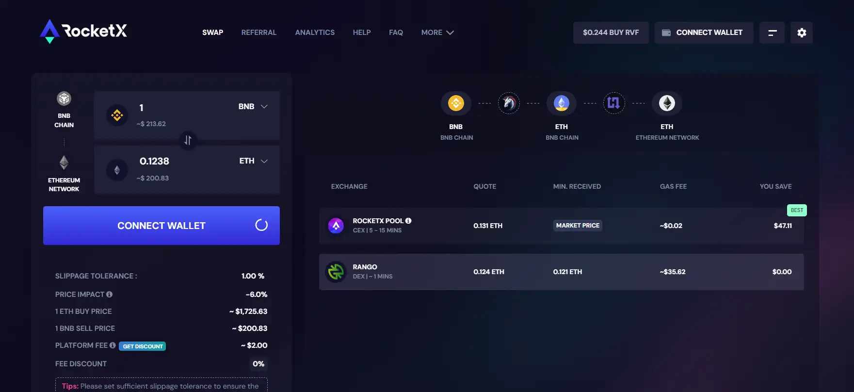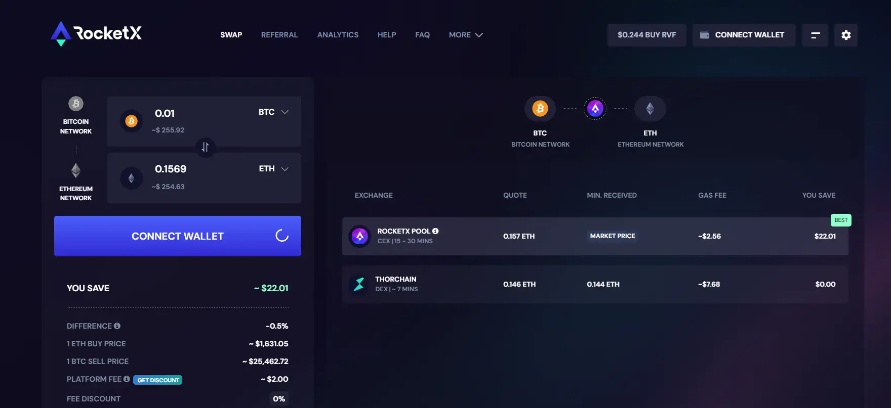 - Best Rates and Low Fees: By aggregating liquidity from multiple exchanges, RocketX offers some of the best trading rates with lower fees, especially when using RVF tokens for transactions.