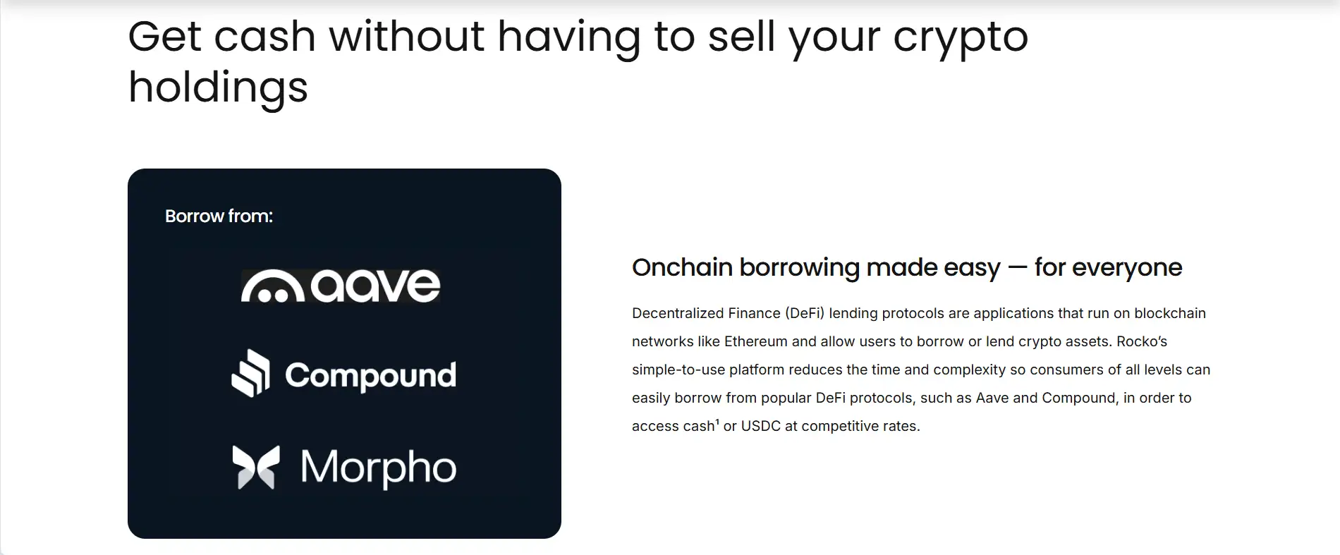 One of Rocko’s standout features is Rocko ReFi, a refinancing tool that uses blockchain-native flash loans to automatically move loans between protocols like Aave and Compound, always ensuring users benefit from the best available interest rates. Unlike traditional platforms such as Ledn or Arch Lending that involve centralized custody and higher administrative fees, Rocko offers a fully non-custodial, self-directed lending experience.