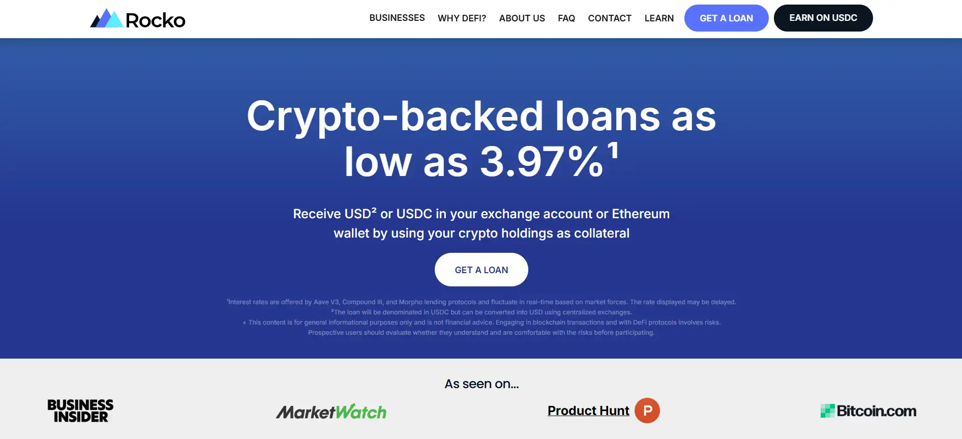 Rocko bridges the gap between complex DeFi lending protocols and everyday users by offering an easy-to-use platform where loans can be set up within minutes. Users can post ETH, WBTC, AAVE, LINK, UNI, wstETH, and cbETH as collateral to access crypto-backed loans with transparent, competitive rates starting as low as 4.05% APR. Through integrations with audited protocols like Aave and Compound, Rocko ensures that all funds are secured within non-custodial smart contracts, maintaining full user control.