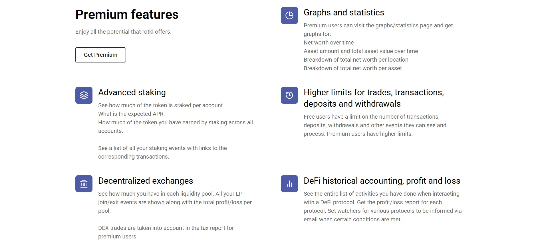 Free users have access to core features such as viewing recent transactions, net worth graphs (limited to 2 weeks), and integration with select services. Premium users unlock advanced analytics, higher data limits, detailed staking and profit/loss reports, and syncing across multiple devices with encrypted backups. Unique to Rotki is also a bespoke crypto accounting service where professionals use the software and custom scripts to help users reconcile complex portfolios for reporting or audit purposes.