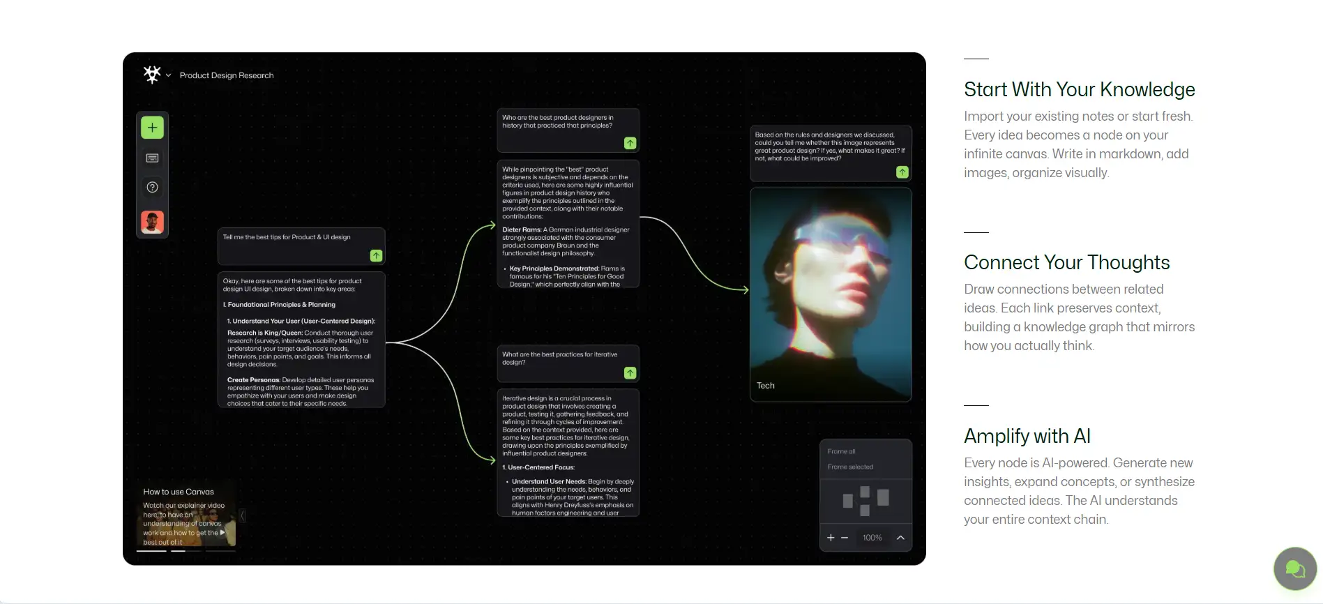 - AI-Powered Nodes: Each node can generate, rewrite, or synthesize ideas based on connected content, making the AI aware of your thought process.