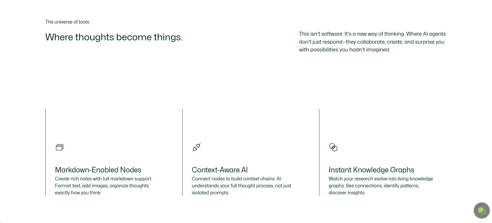 This spatial system allows users to build context chains between nodes, which the AI uses to understand relationships, draw insights, and generate content in a way that reflects how people naturally think. The canvas becomes a digital reflection of a user’s mind—one where knowledge is not only stored but also activated, evolved, and intelligently connected. Each node supports markdown, rich formatting, code, images, embedded videos, and more, allowing for multi-modal idea building.