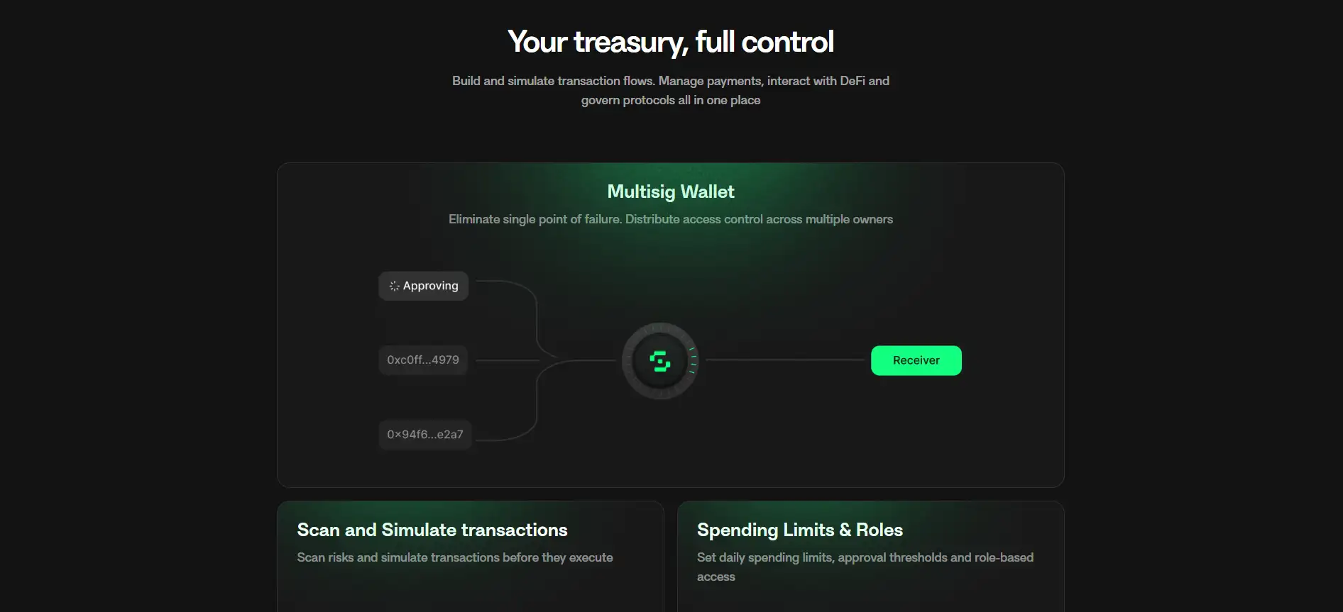 Safe eliminates the traditional single-key risk by using multisig smart contracts, where multiple wallet owners must approve transactions before they are executed. This means that no single user has full control over an organization’s funds. For example, a team can configure a 3-of-5 signing structure where three members must confirm any transaction. This model provides enterprise-grade security and aligns with Safe’s mission of eliminating single points of failure. Users can set up this structure directly in the Safe App and define roles and permissions tailored to their team’s needs.