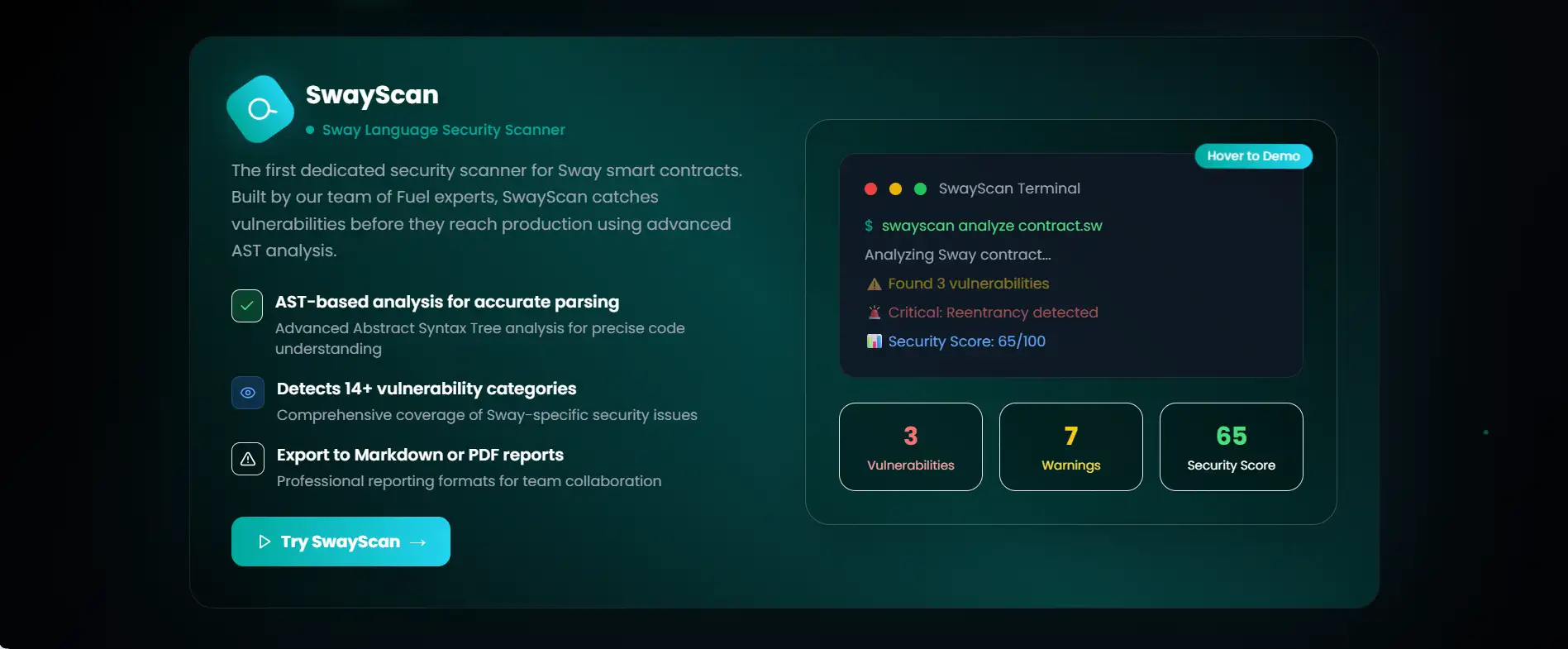 - Developer-First Products: SwayScan offers the first dedicated scanner for Sway contracts with AST-based analysis and Markdown export support.