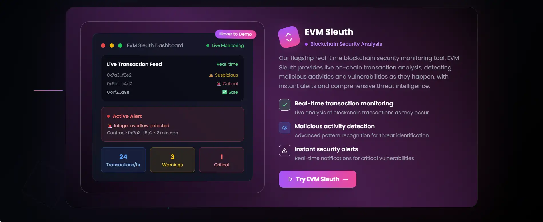 - Real-Time Monitoring Tools: EVM Sleuth continuously analyzes on-chain activity, detecting threats before they become exploits.