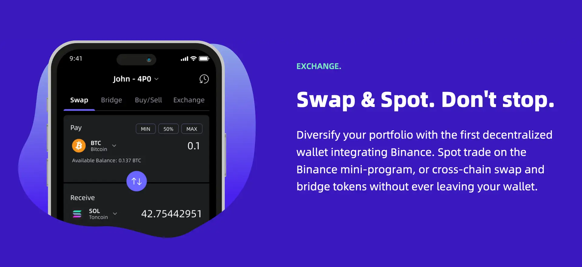 - Integrated Trading: Includes DEX and CEX integration for perps and spot trading, real-time charts, swap features, and Binance mini-program access.