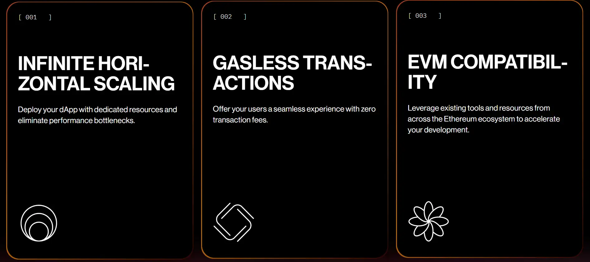 - Infinite Horizontal Scalability: Applications never compete for resources thanks to elastic, parallelized chain infrastructure.