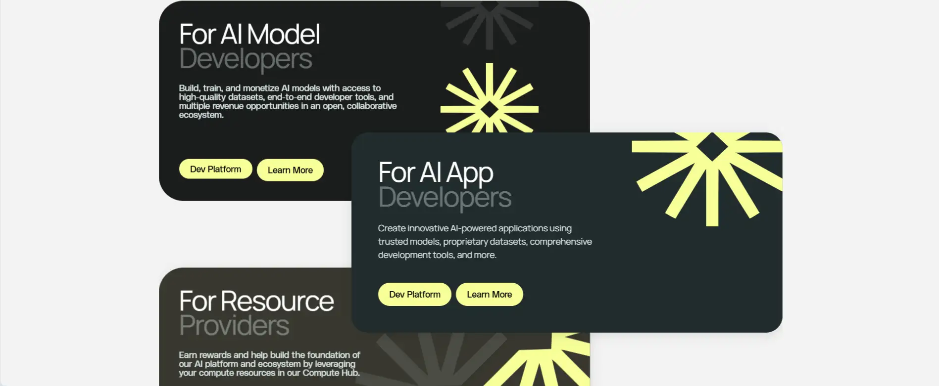 - Contribute Compute or Data: Become a resource provider or data contributor to earn rewards and support AI development at scale.