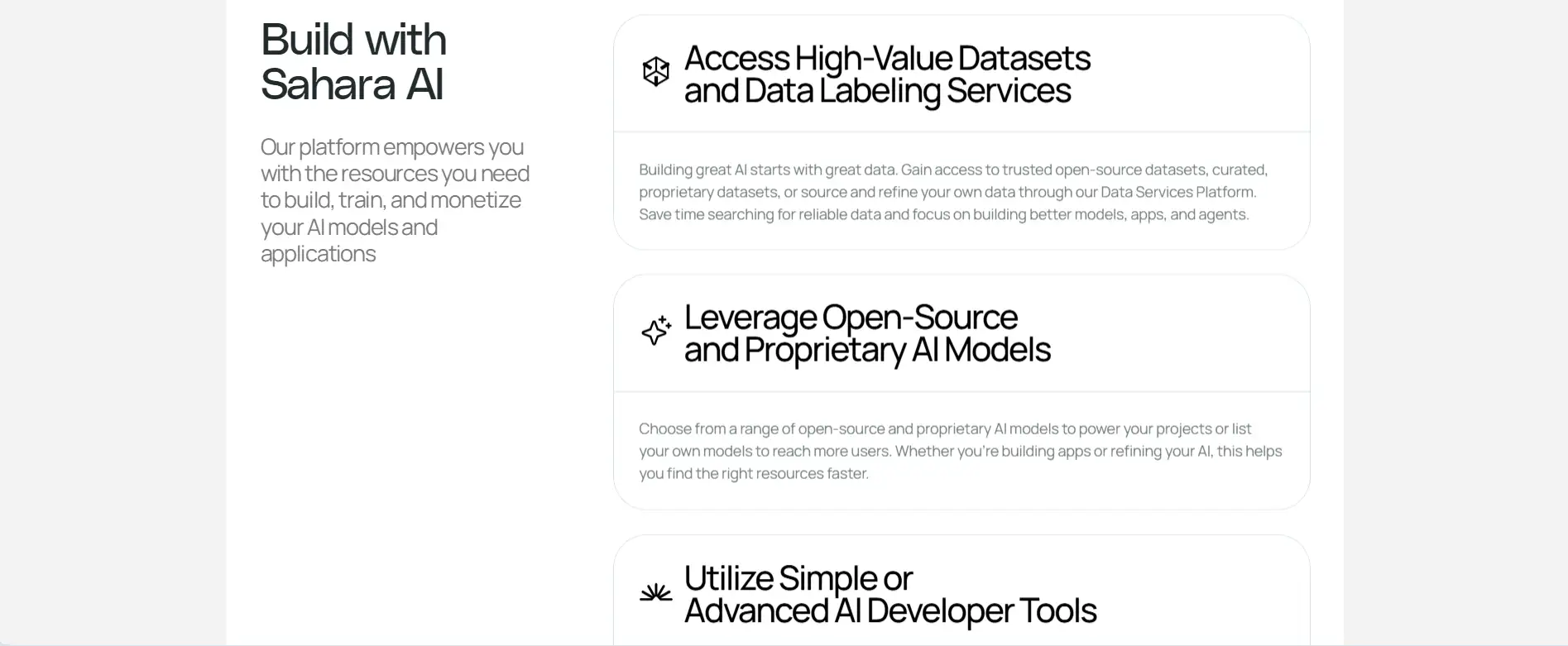 - End-to-End AI Development: From data annotation to model deployment, Sahara AI offers complete tooling for AI creation and monetization.
