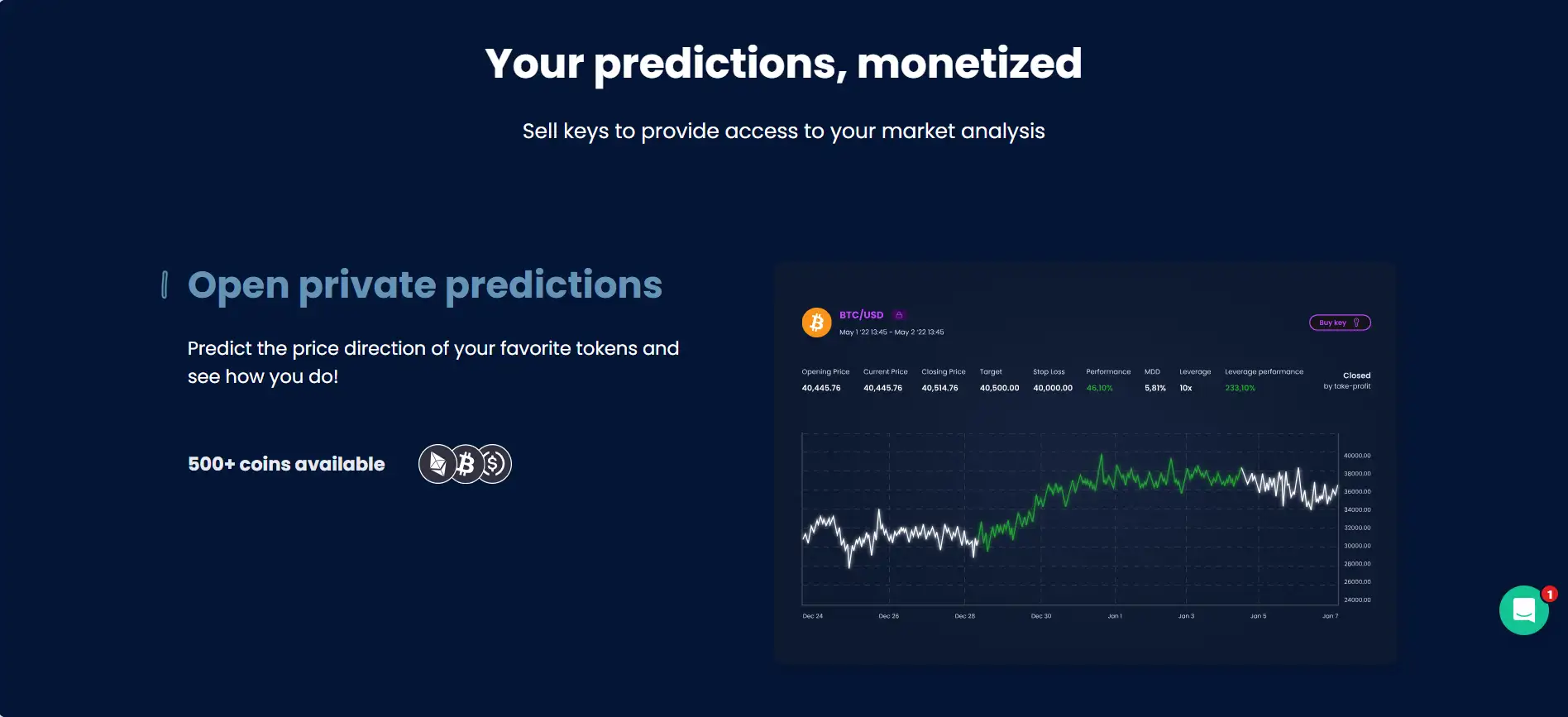 - Prediction Monetization: Sell keys to your private market insights and get paid for your forecasting skills.