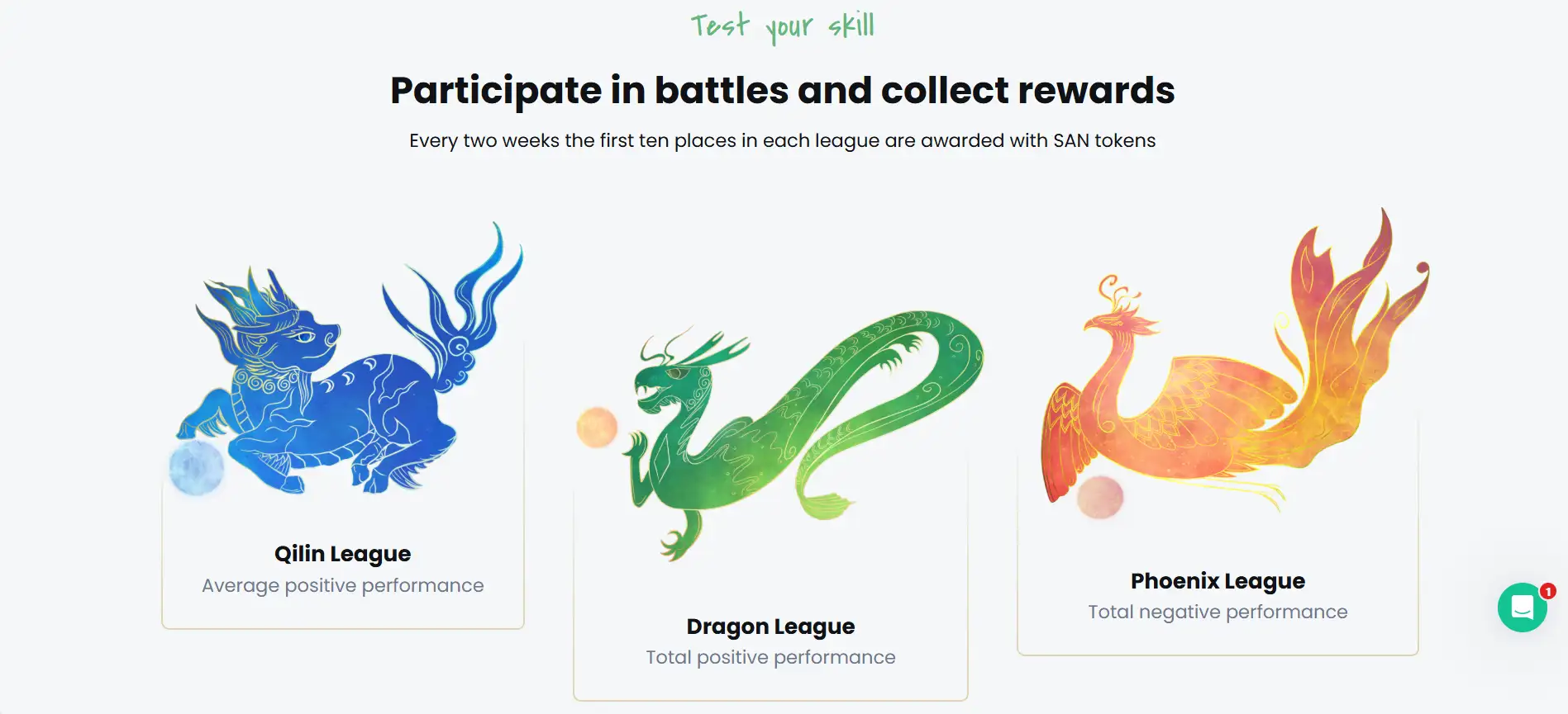 SanR operates a tiered league system (Qilin, Dragon, Phoenix), and every two weeks, the top 10 performers in each league are rewarded in SAN tokens. The system is based on metrics like positive performance and consistency. First-place can earn up to 300 SAN, incentivizing accuracy over volume.
