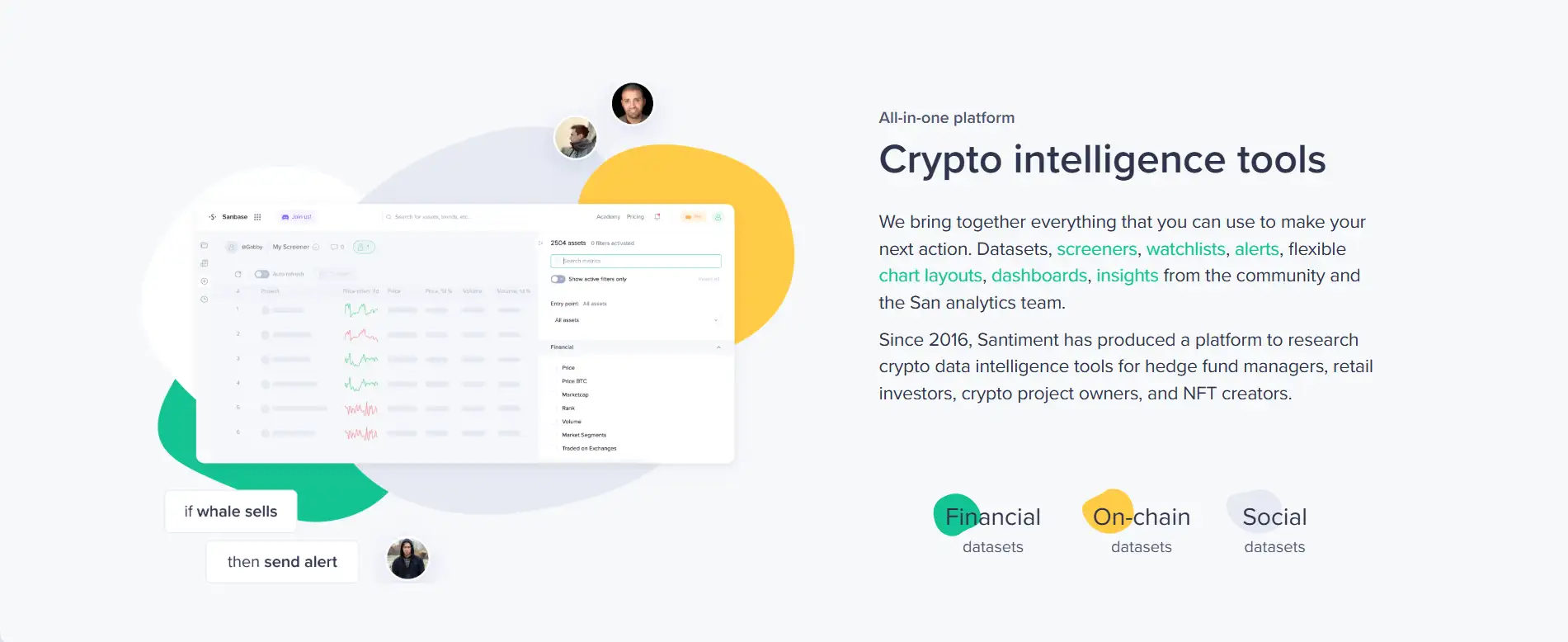 - Sanbase Platform: Access 2,500+ asset profiles, 1,100+ metrics, and 75M+ labeled ETH addresses with advanced charting tools.