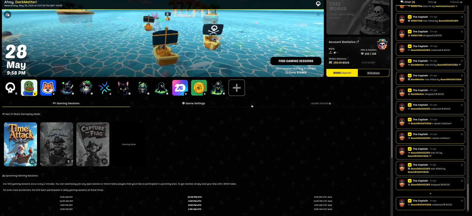 - Time-Attack Mode: Compete against over 100 ships. Preload with $SOS to enter. The more ships you destroy, the more treasure you collect. The top players keep all loot at the end of the timer.
