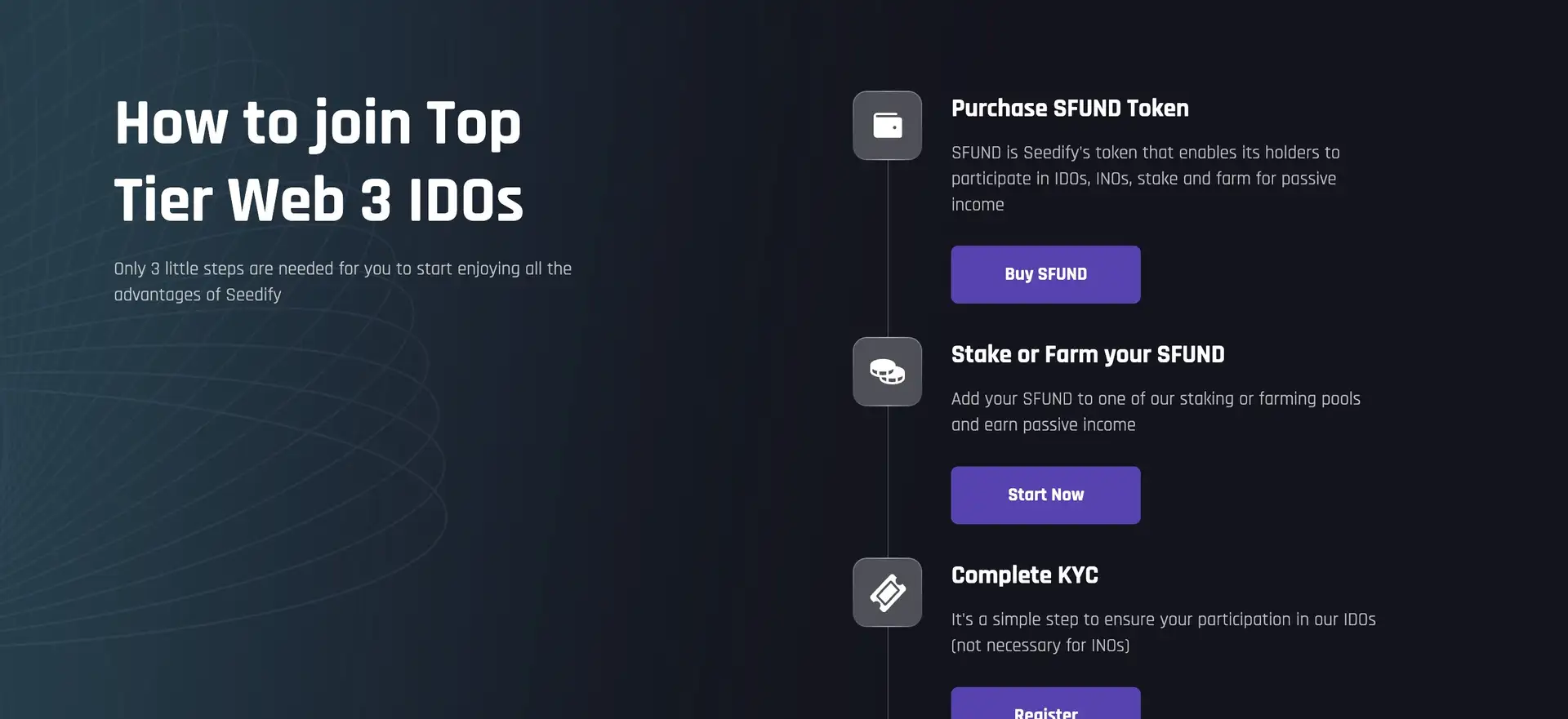 To get started with Seedify, create an account on the Seedify platform. Follow the registration process and complete the KYC verification. Once verified, you can explore projects, participate in IDOs/INOs, and start staking your tokens. Here are the steps to get started:
