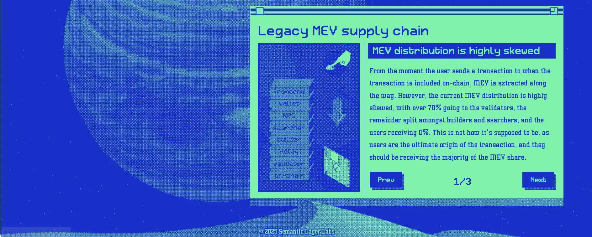 Semantic Layer addresses one of the most pressing problems in modern blockchain architecture: the misalignment of incentives in the MEV (Maximal Extractable Value) supply chain. In traditional chains, MEV generated by user activity is captured primarily by validators and builders—with users receiving no compensation despite originating the transaction value. This imbalance creates a distorted and extractive system that degrades trust in DeFi and undermines user experience.