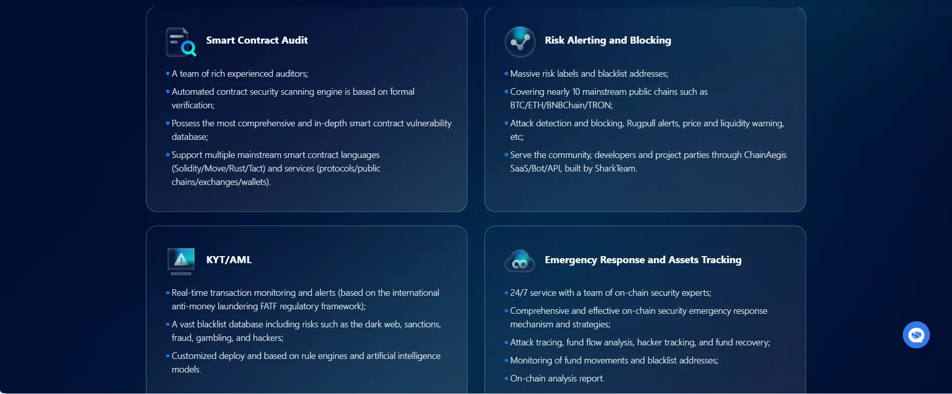 One of the core services of SharkTeam is Smart Contract Auditing, supported by a combination of experienced auditors and formal verification-based automated scanners. The audit engine draws from one of the most comprehensive smart contract vulnerability databases in the industry and supports multiple languages including Solidity, Move, Rust, and Tact. SharkTeam audits a wide range of services including dApps, protocols, exchanges, and wallets.