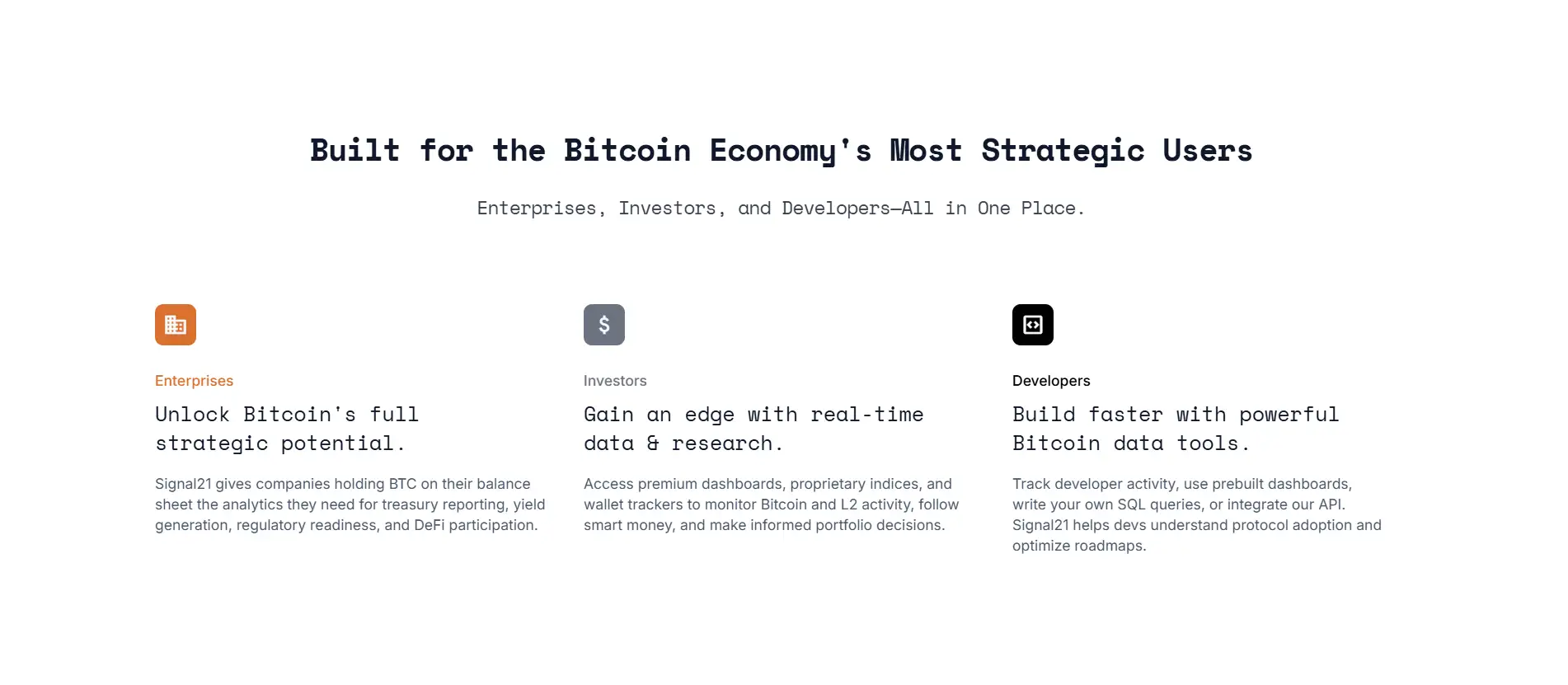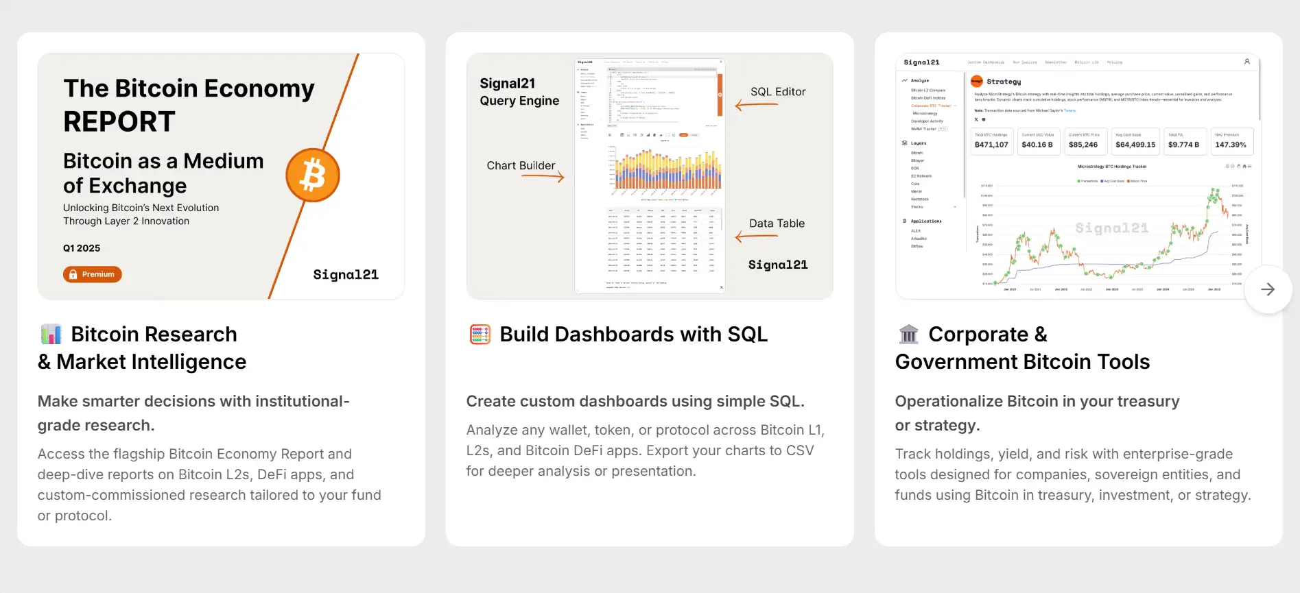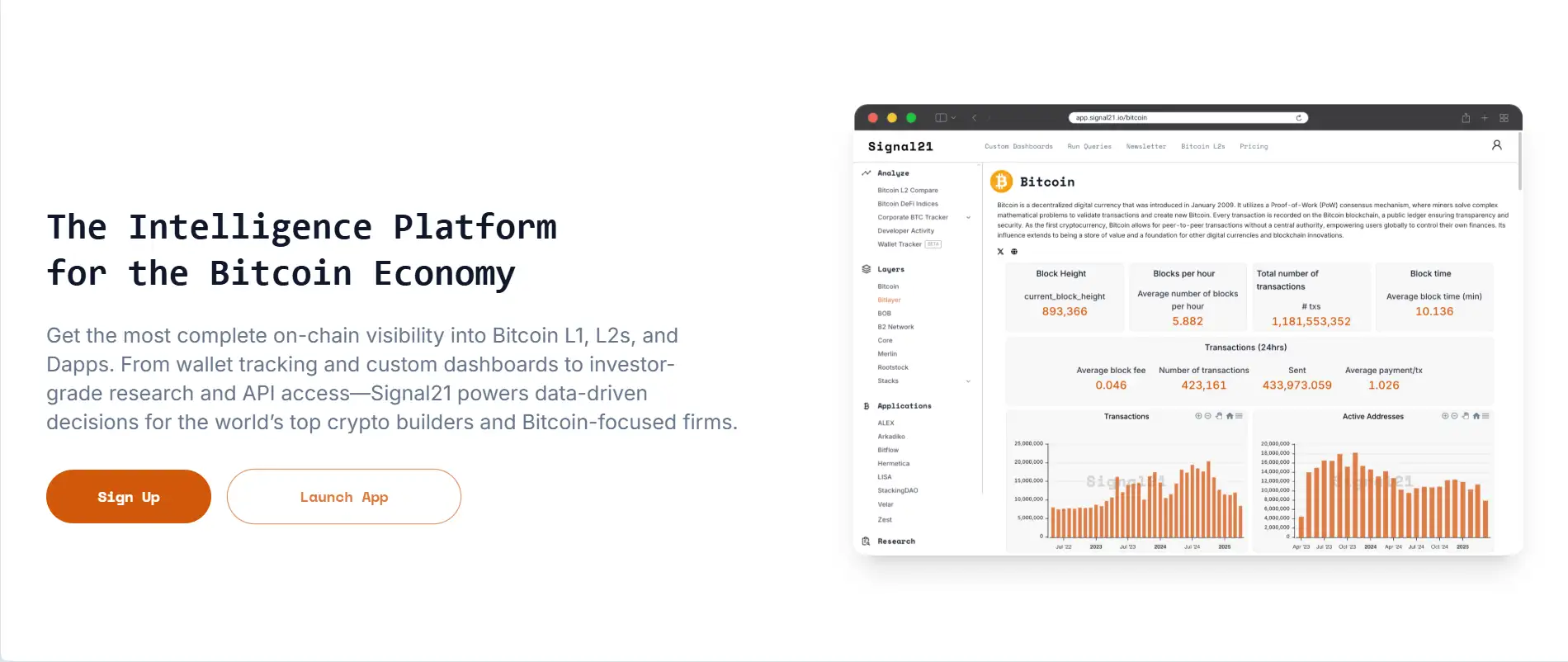Signal21 delivers the most advanced suite of Bitcoin analytics tools available today. As Bitcoin matures beyond its role as a digital store of value, a new wave of Layer 2 protocols, dApps, and treasury management tools are emerging—creating a complex, fast-evolving landscape. Signal21 helps users navigate this terrain by offering unified access to high-quality data and investor-grade insights.
