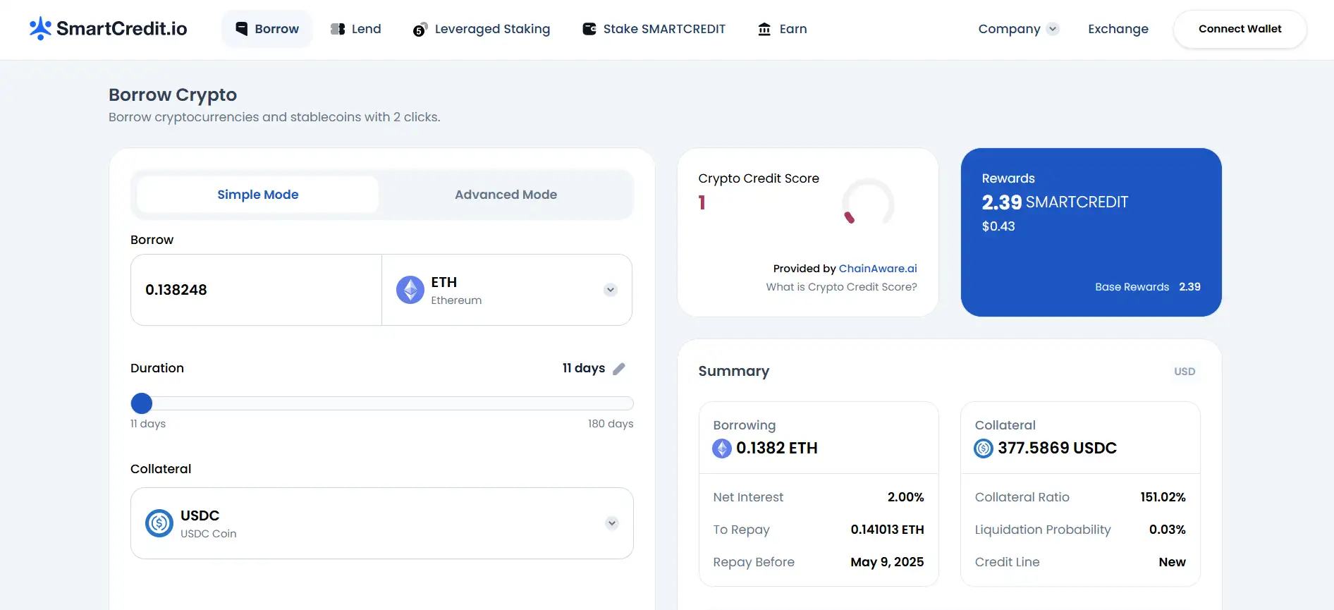 - Connect Wallet: Visit SmartCredit.io and click “Connect Wallet” to link your crypto wallet.