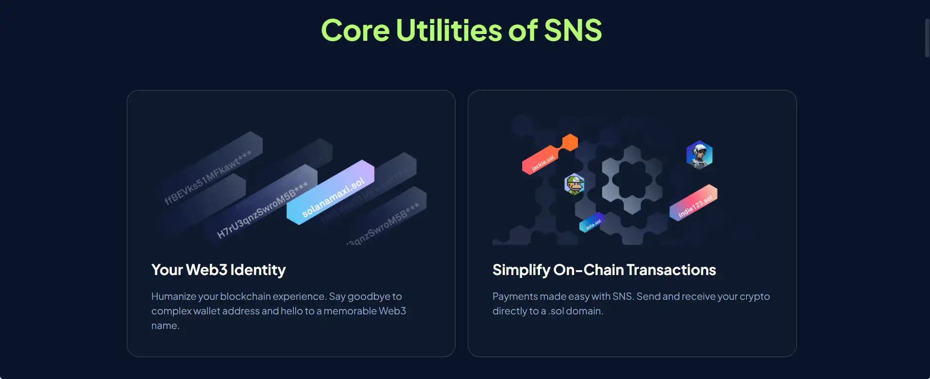 8Jh3...k4M, users can simply send and receive assets to names likealex.sol. This reduces errors, makes crypto more intuitive, and enhances how users interact with dApps and communities. Learn more at sns.id.Yes. .sol domains work as readable aliases for Solana wallet addresses, allowing you to send, receive, and verify transactions without needing to view the full address. They’re already integrated with major wallets and platforms across the Solana ecosystem. When someone sends you crypto, they just enter your .sol name. Try it at sns.id.