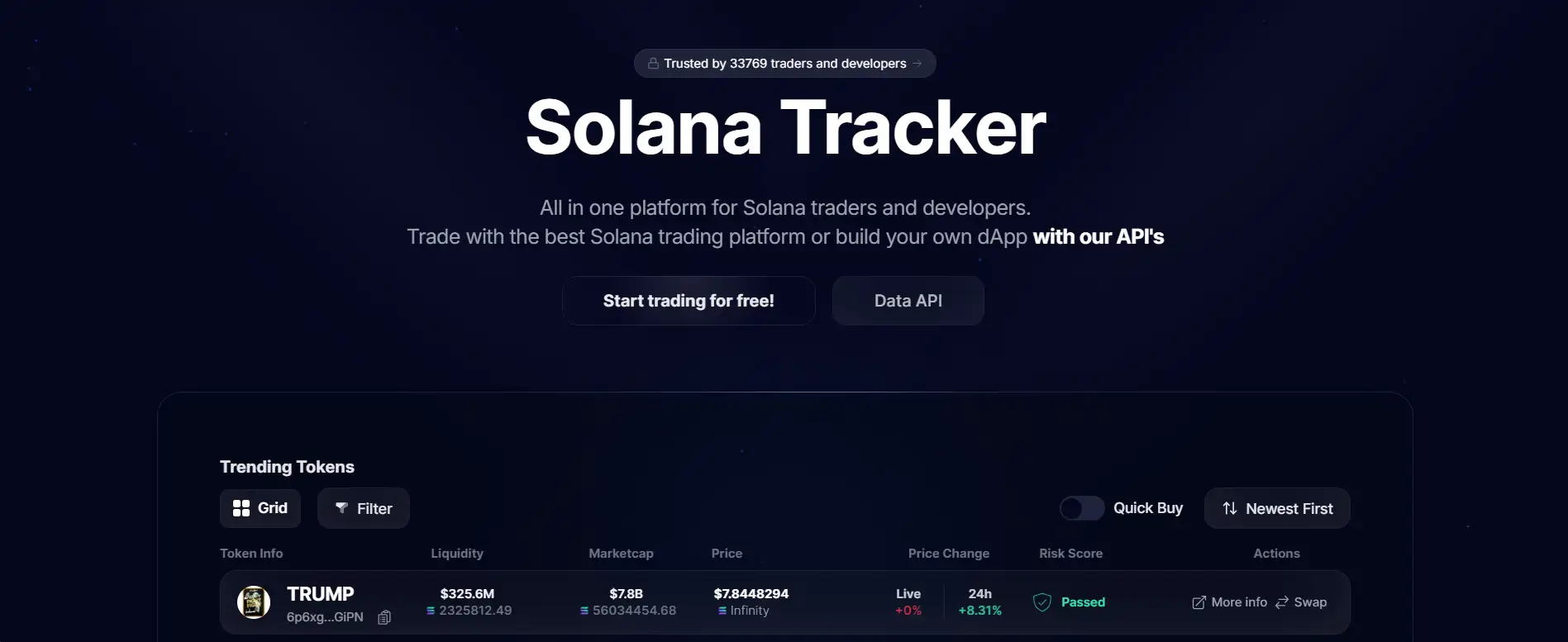 Solana Tracker is trusted by over 33,000 users for its real-time token data, secure trading environment, wallet tracking features, and developer-friendly APIs. Whether you're actively swapping meme coins on Pumpfun or building the next dApp, Solana Tracker gives you the edge with its full-stack trading tools, automated rugcheck system, and market insights across Raydium, Orca, Moonshot, and Meteora ecosystems.
