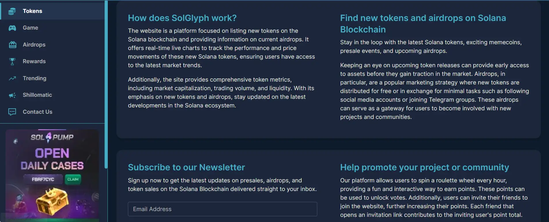 SolGlyph uses a unique gamified system where users earn points by spinning a roulette wheel every hour or inviting friends through referral links. These points can be exchanged to vote for tokens listed on the site, which helps increase their visibility on trending pages. The more points you collect, the more influence you have in boosting token popularity. This system turns discovery into an interactive experience and supports community-based promotion.