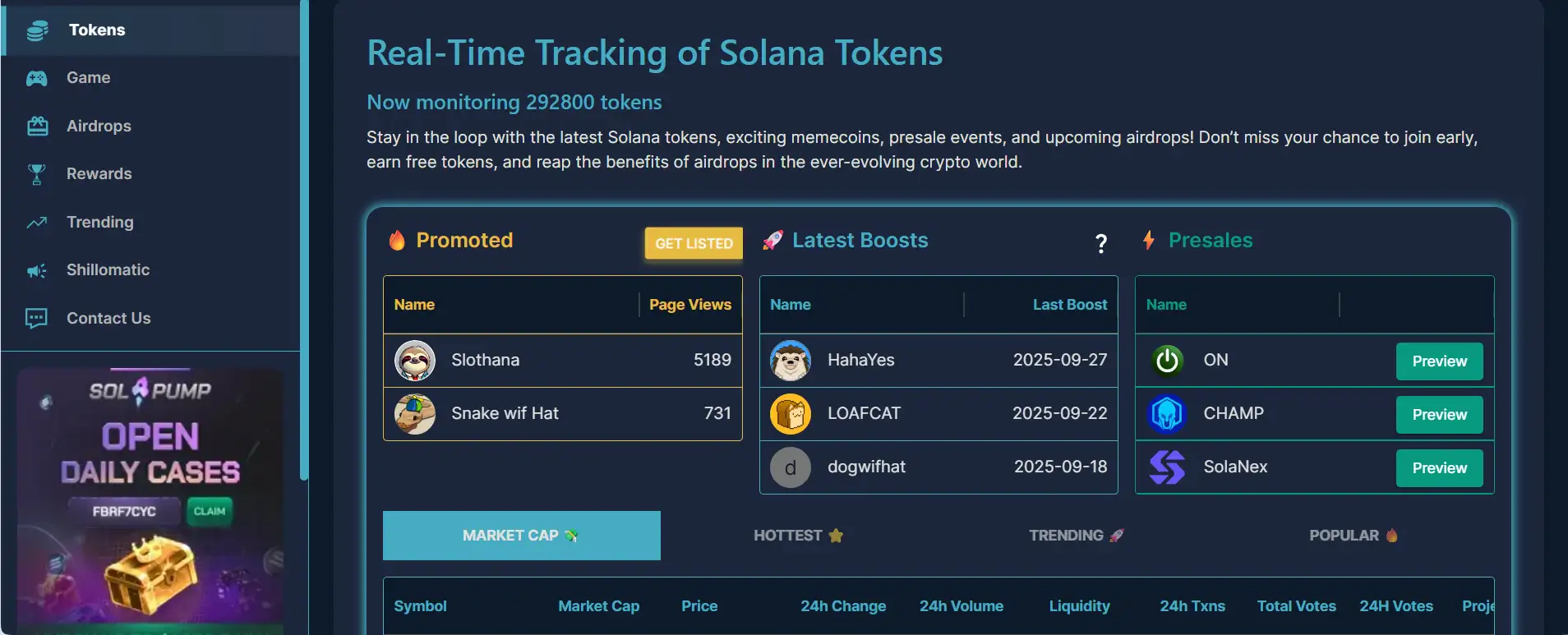 - Real-Time Token Tracking: Monitors over 292,000 Solana tokens with live price, liquidity, trading volume, and market cap data.