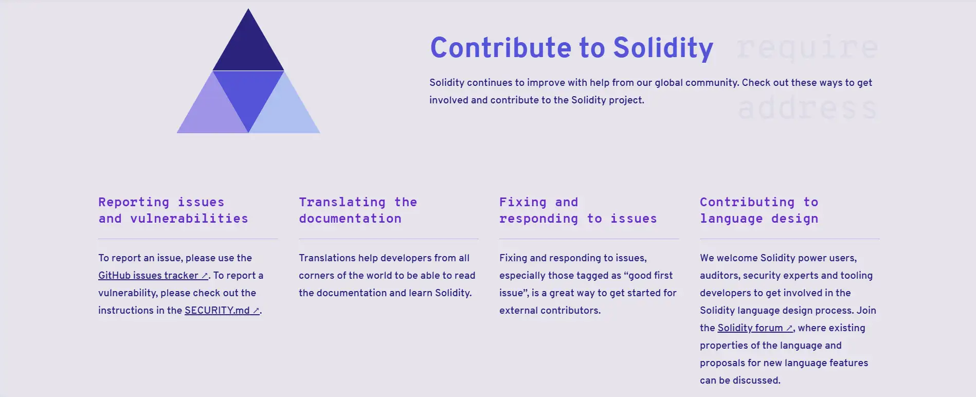 - Contribute: Help improve Solidity by submitting issues, translating docs, or contributing to the open-source repository.