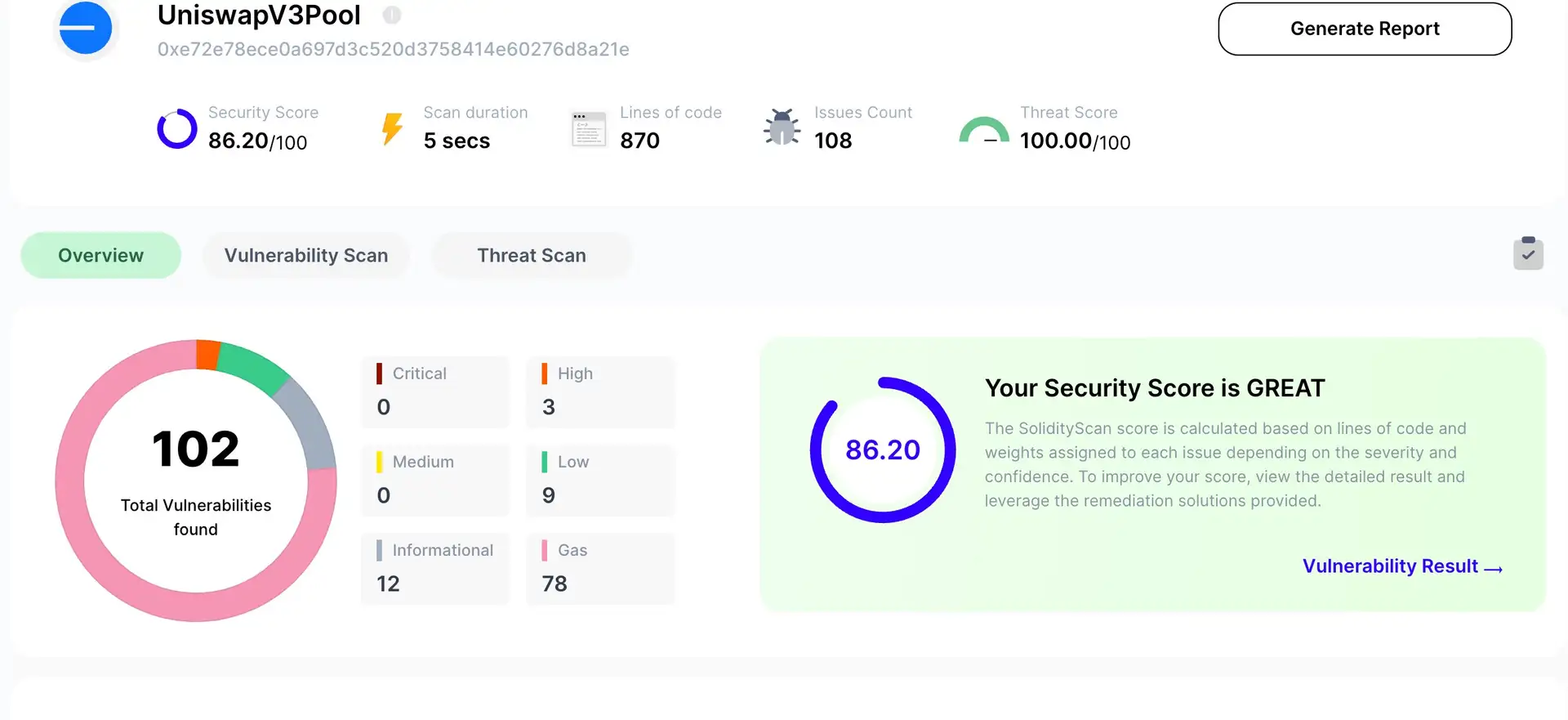 - Automated Security Analysis: SolidityScan provides instant scanning and vulnerability detection, ensuring that smart contracts are secure before deployment.