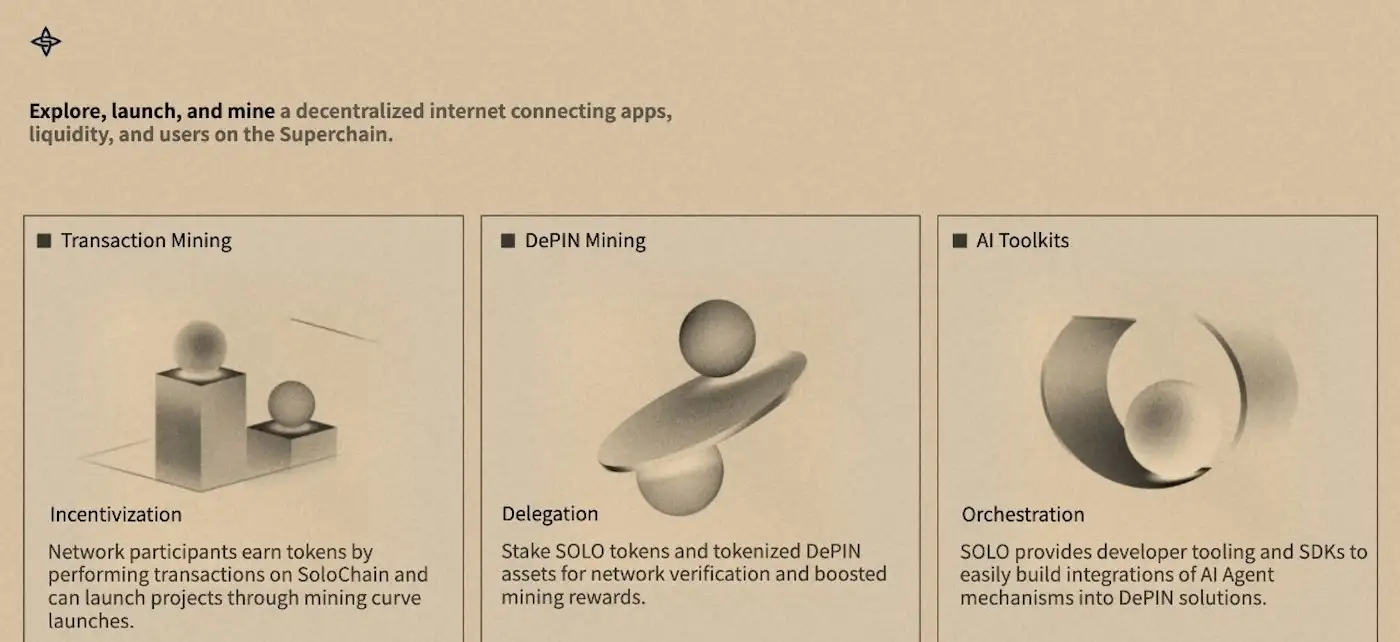- DePIN Mining: Stake SOLO tokens and tokenized DePIN assets to secure the network and receive mining rewards.