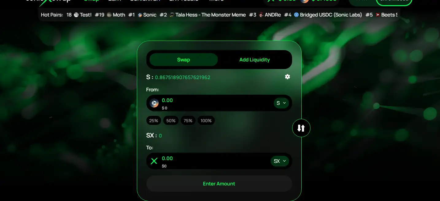 - Lightning-Fast Swaps: Trades are executed within seconds on the Sonic blockchain with minimal fees.