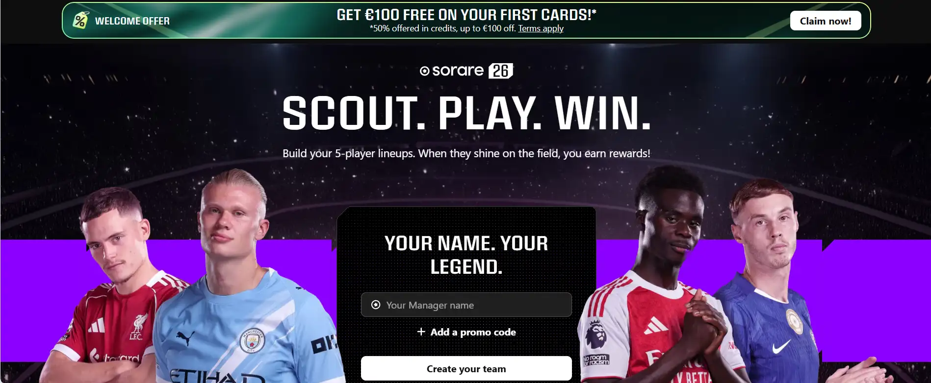 - Create an Account: Head to sorare.com and sign up for free. You’ll be asked to choose a manager name and can enter a promo code to receive a welcome bonus.