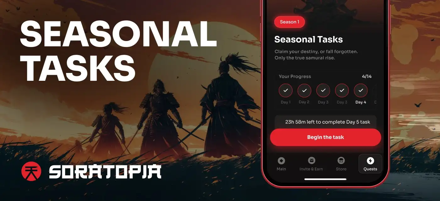 Seasonal tasks in SORATOPIA are limited-time challenges that offer players unique quests, collectibles, and additional rewards. These tasks are designed to align with in-game events or real-world seasons, ensuring a dynamic and ever-evolving experience. Completing seasonal tasks can unlock exclusive items or give players a significant boost in their earnings. Players can access these tasks via the Telegram bot and should keep an eye on updates from @Soratopia_Game on X for announcements.
