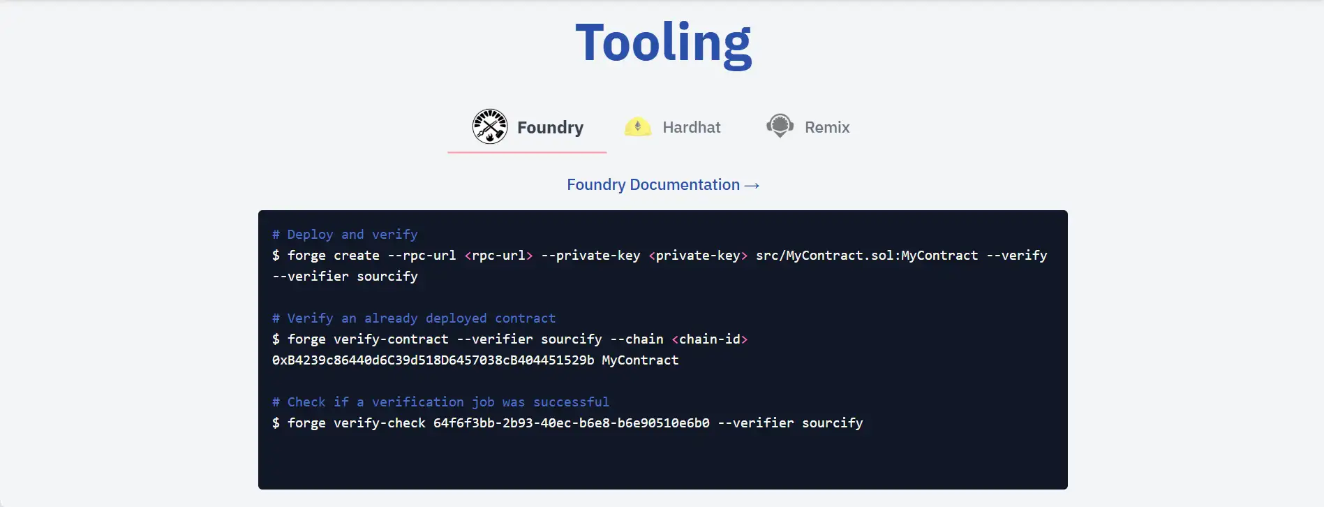 Sourcify supports direct integration with CLI tools such as Foundry and Hardhat. Developers can use commands like