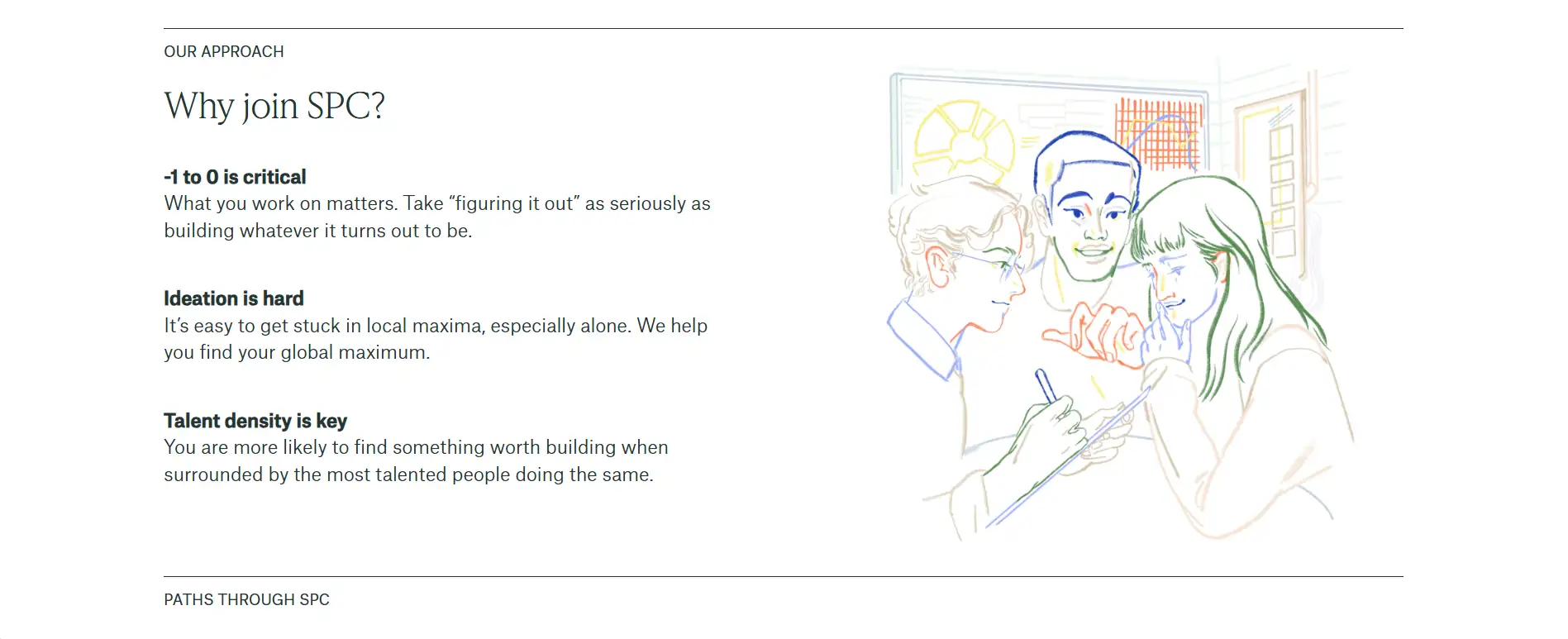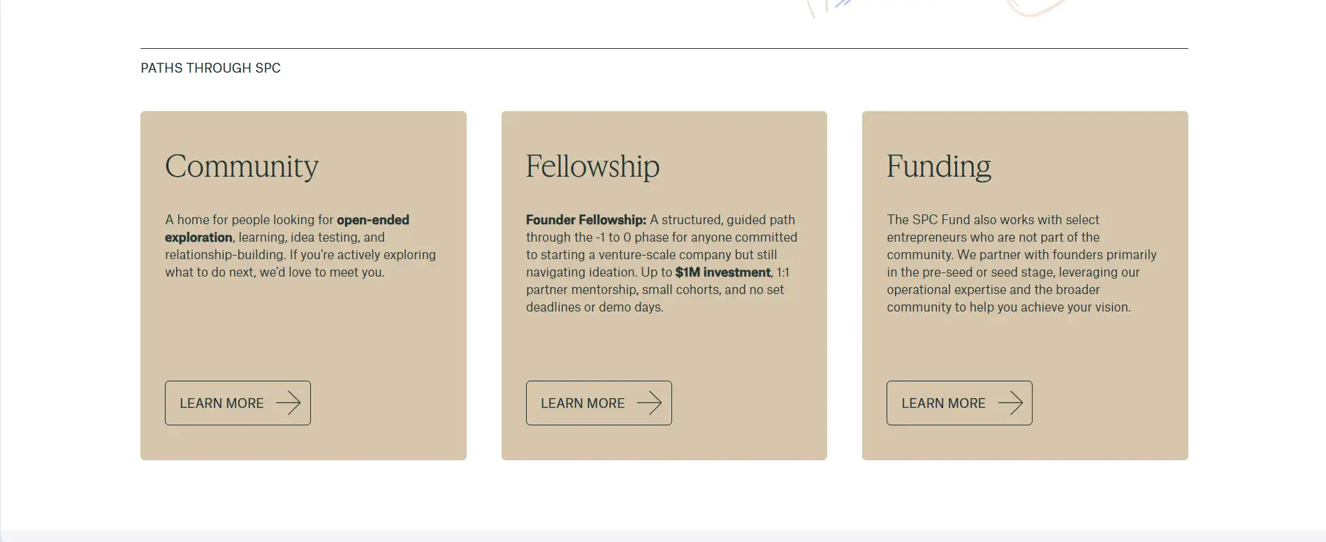 SPC also offers the Founder Fellowship, a guided program for people who are serious about building venture-scale companies but are still in the ideation stage. The fellowship includes up to $1M in investment, 1:1 mentorship with experienced partners, and access to a tight-knit cohort of fellow builders — all with no set deadlines or pitch days. This structure empowers fellows to develop conviction over time, rather than rushing into startup formation prematurely.