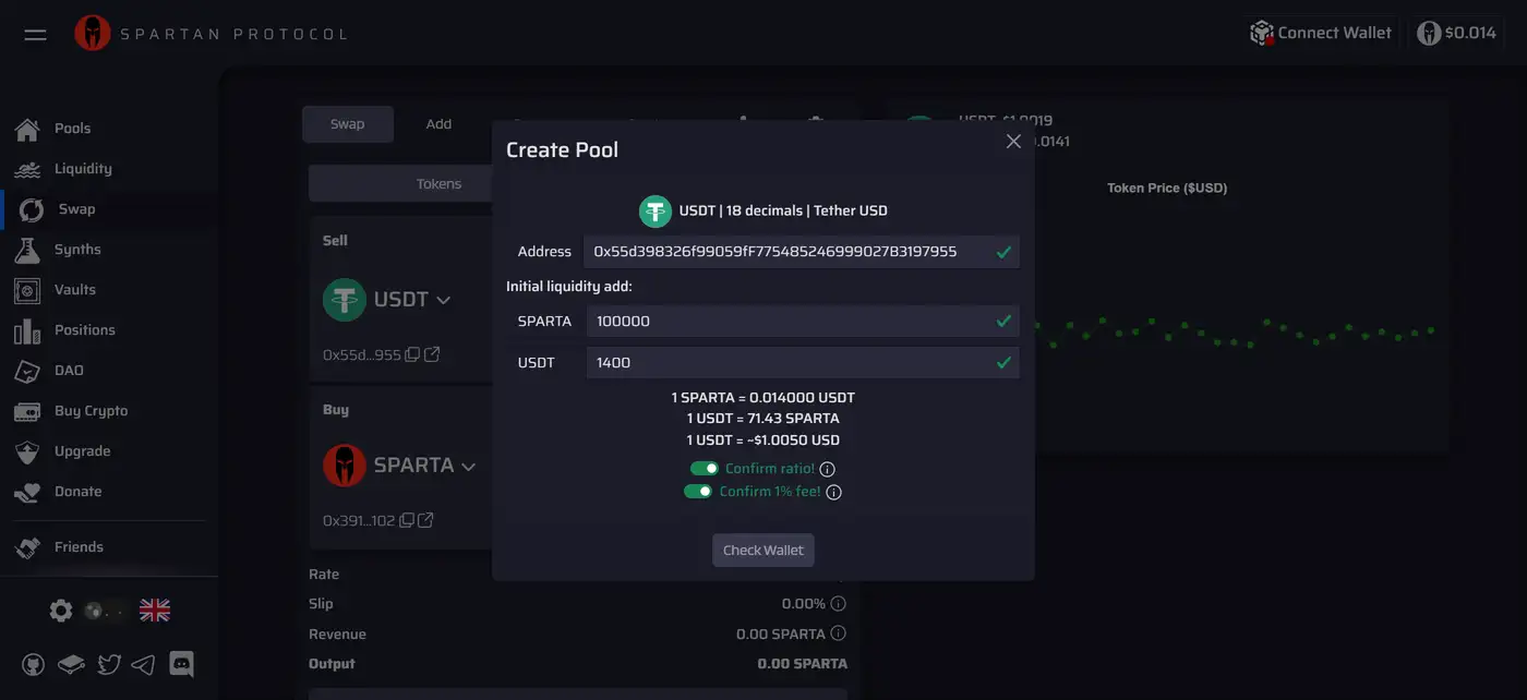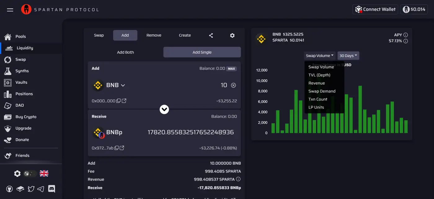 - Access Spartan Protocol: Navigate to the Spartan Protocol dApp and connect your wallet. This will allow you to access all features of the platform, including staking, liquidity provision, and synthetic asset creation.