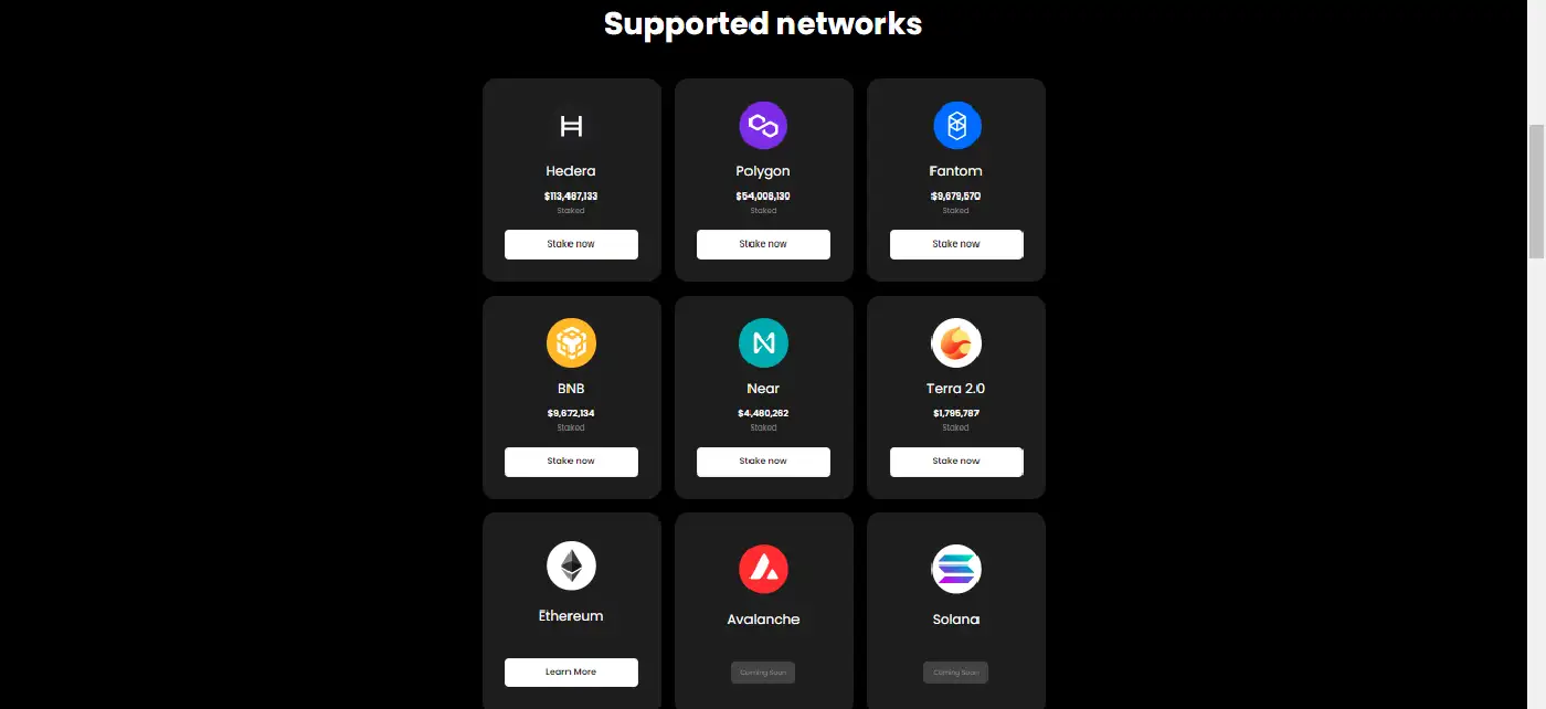 - Multi-Network Support: The platform supports staking for multiple blockchain networks, including Ethereum, Polygon, Binance Smart Chain, and Hedera. This diversity allows users to spread their staking activities across different ecosystems and earn rewards from various sources.