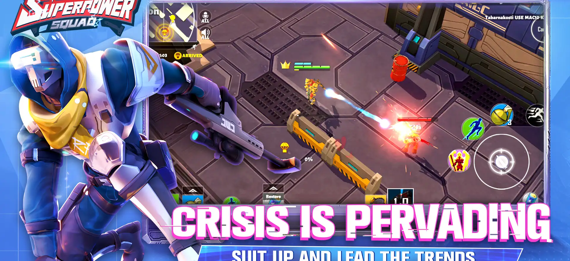 Superpower Squad offers multiple game modes, including Death Match, Zombies Crisis, Gem Battle, Emergency Action, and Kings of the Battle.