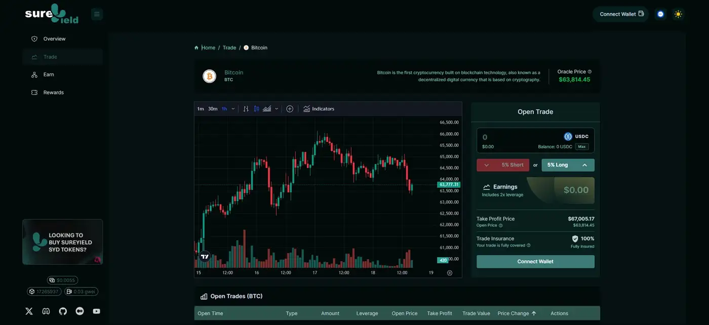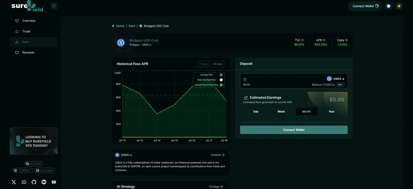 - Deposit USDC: Transfer USDC to your SureYield account. This can be done by connecting your wallet and following the on-screen instructions.