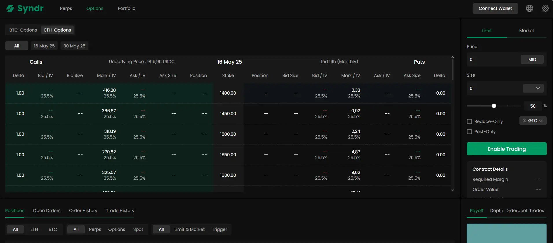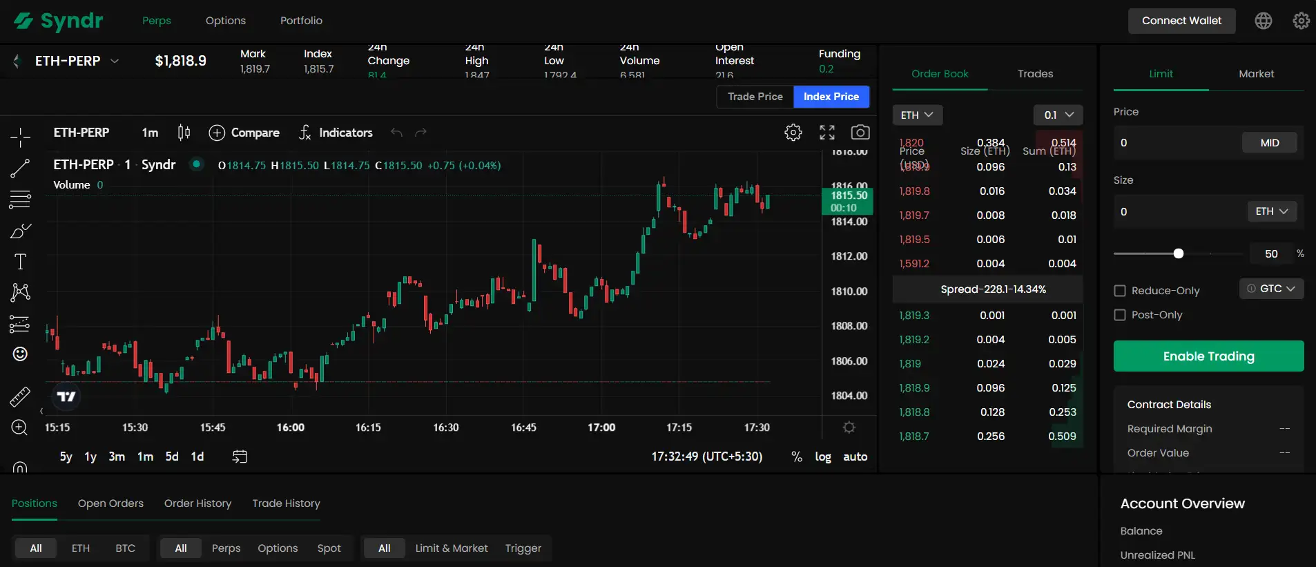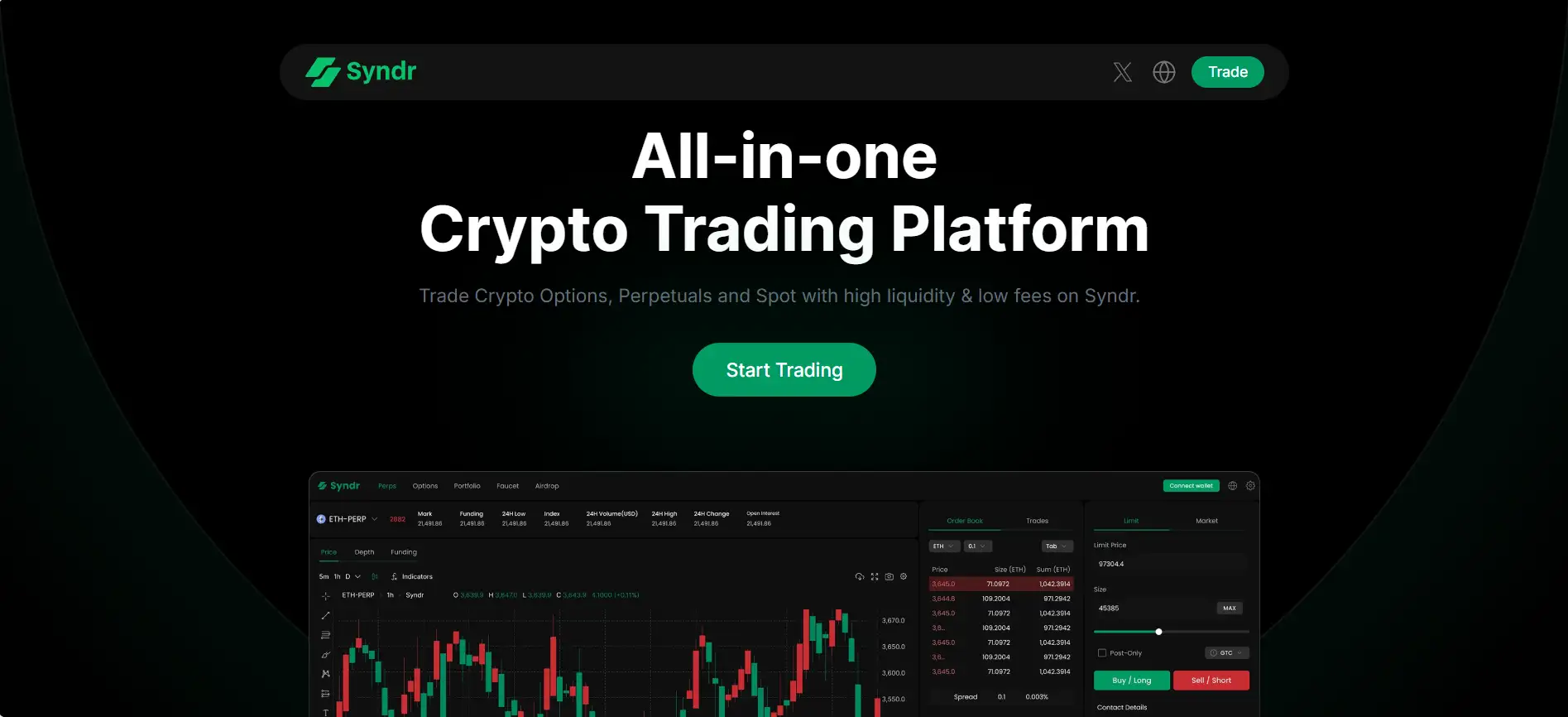 Syndr is a next-generation, all-in-one decentralized trading platform designed to bring institutional-grade derivatives trading to DeFi. Built with professional traders in mind, Syndr allows users to seamlessly trade Options, Perpetuals, Futures, and Spot on a unified platform with high capital efficiency, ultra-low latency, and gas-free execution. The platform’s powerful hybrid infrastructure merges an off-chain limit orderbook with an on-chain Layer-3 rollup to deliver the best of speed, scalability, and self-custody.