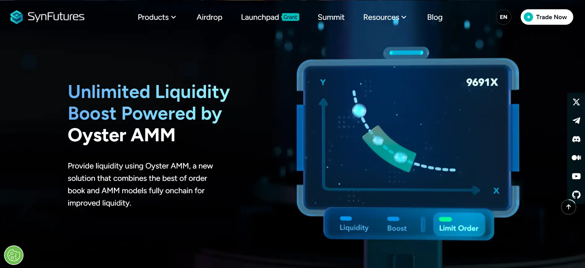 Driven by continuous innovation, SynFutures is best known for its Oyster AMM, an advanced liquidity model that merges the strengths of both AMM and order book systems. The platform introduces features like single-token liquidity provision, unified liquidity, and instant 30-second asset listings, creating an intuitive and powerful experience for all kinds of traders. With backing from major industry leaders and over $75B in trading volume, SynFutures is shaping the future of derivatives on-chain.