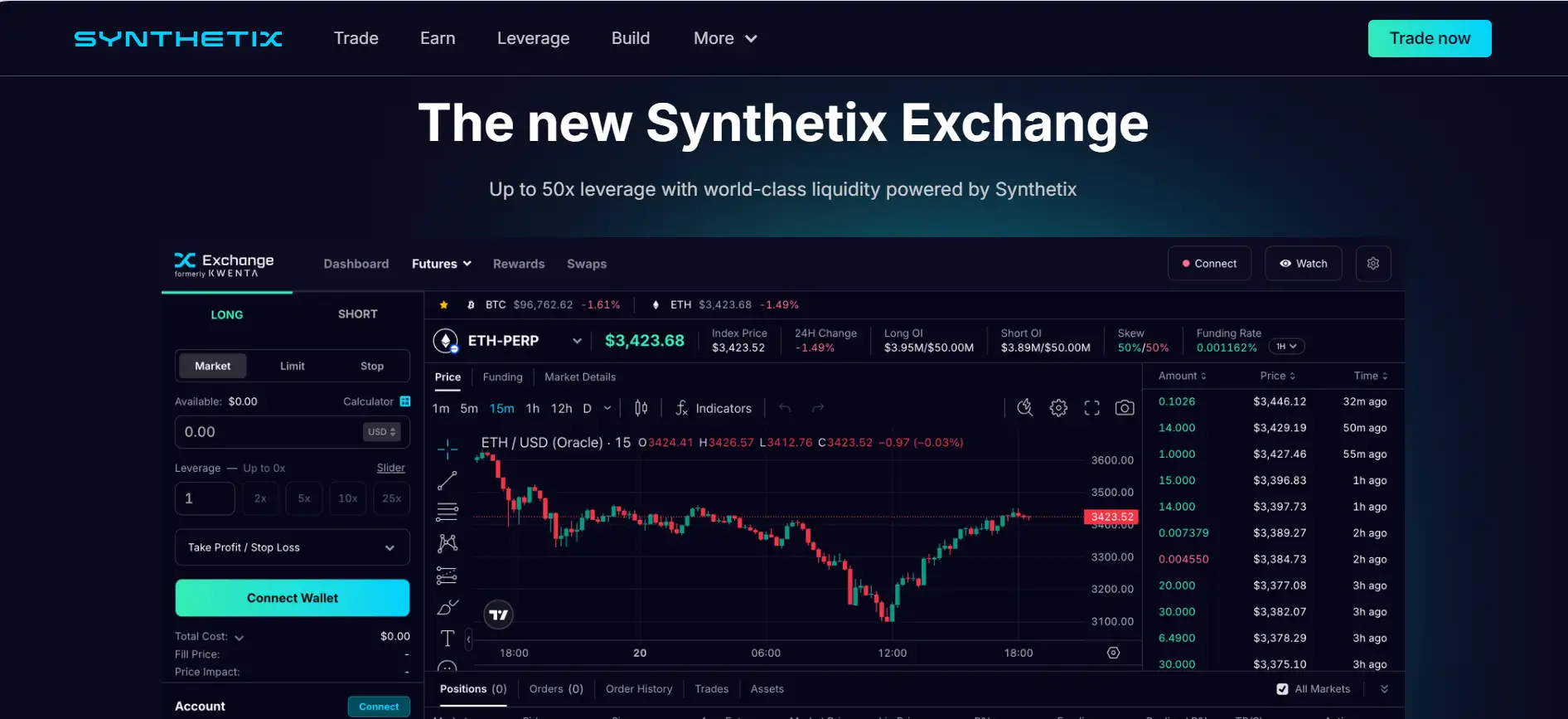 - Trade Perpetuals: Go to Synthetix Exchange and access 90+ markets with multi-collateral support and up to 25x leverage.
