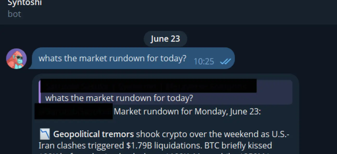 - Join on Telegram: Purchase credits and begin chatting with Syntoshi via the Telegram interface — you’ll get private access to ask high-impact questions about the market.