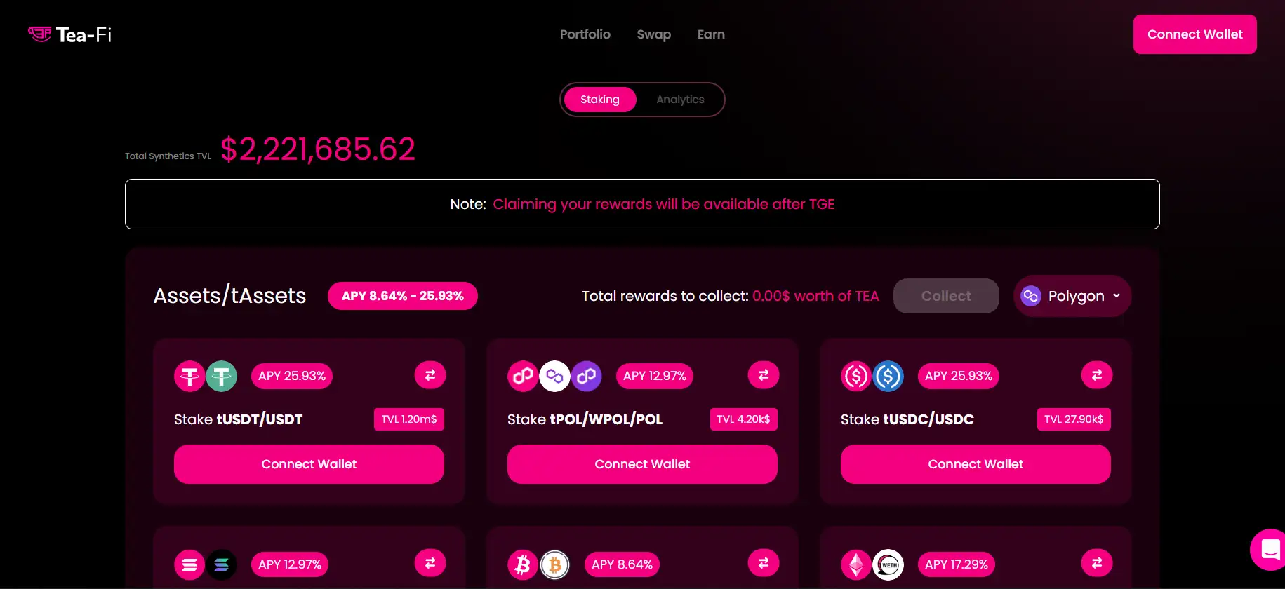 - Dynamic Yield Engine: Access to high-yield opportunities through synthetic asset staking, $TEA staking, and automated yield aggregation, all in one platform.