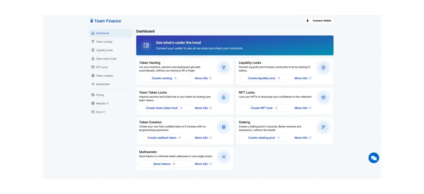 - Comprehensive Token Management: Team Finance allows users to manage all aspects of their tokens from creation to vesting, ensuring that every stage of the token lifecycle is handled efficiently.