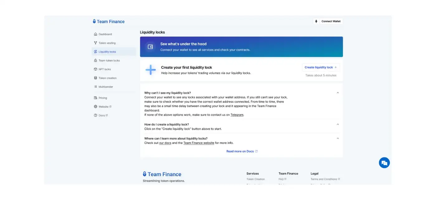 - Liquidity and Trust Enhancement: By allowing projects to create liquidity locks, Team Finance helps to boost investor confidence and enhance the overall trustworthiness of the project.