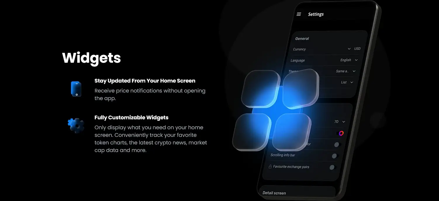 - Customizable Widgets: Provides crypto widgets that users can customize to monitor the market directly from their smartphone’s home screen.