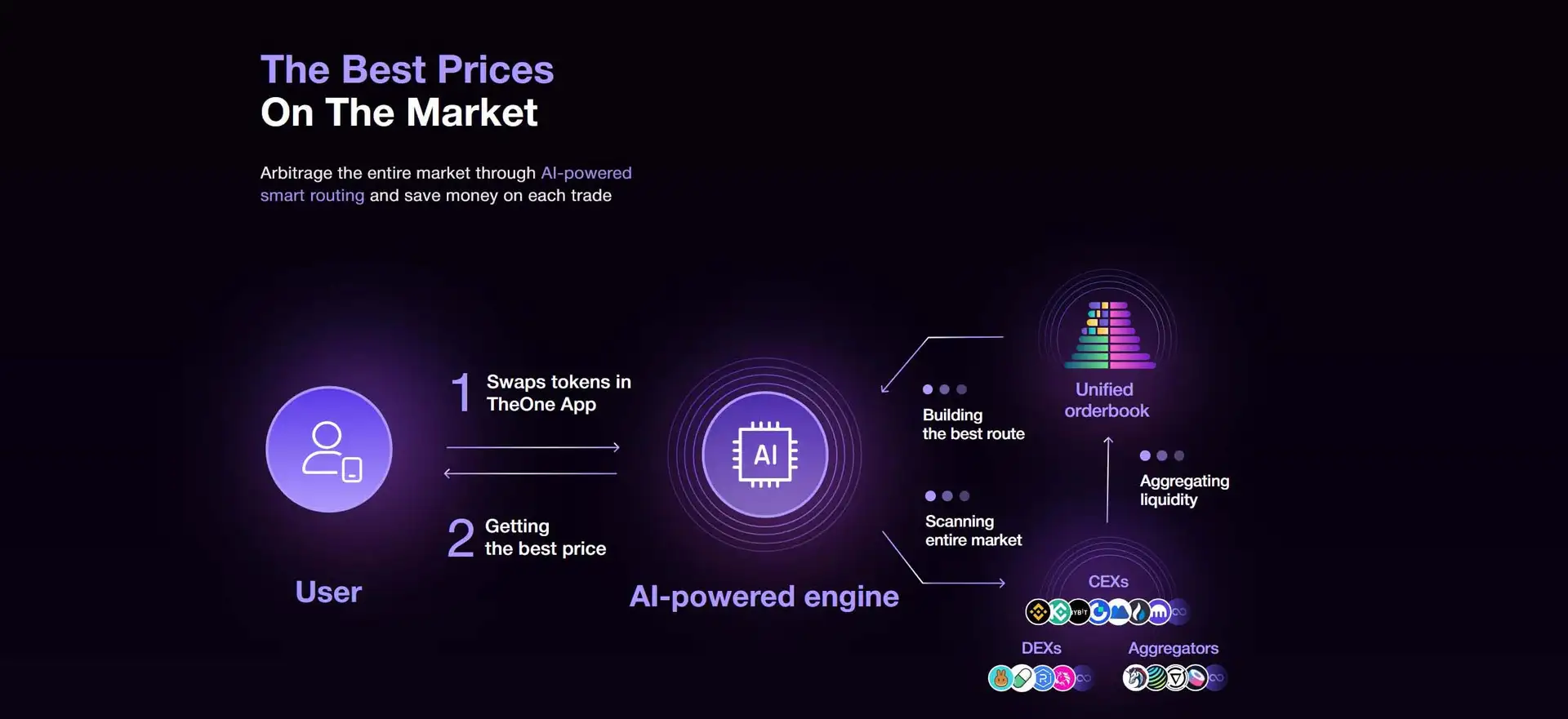 The One was built with the mission to simplify and democratize crypto trading by eliminating the barriers that users typically face with traditional DEXs and CEXs. Unlike centralized exchanges that list a limited selection of tokens or decentralized platforms that can be confusing and costly to use, The One allows users to trade any token using liquidity aggregated from both types of exchanges. This is made possible by its proprietary CEDEX engine, which calculates the most efficient trading route automatically.
